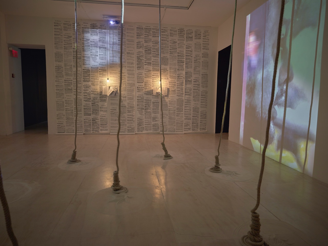 Altogether more concrete and heartfelt, Mortal Coils (1994–95) supplies a valedictory ending to the exhibition in its final gallery. Framing this installation of slowly rotating coils of suspended rope are projected images of fifteen of the artist’s friends who died between 1992 and 1995, one wall covered floor-to-ceiling with newspaper obituaries, their proper names redacted, supplemented by an artless binder of laminated plastic pages. These identify, among others, John Cage, Derek Jarman, Charlotte Moorman, David Rattray, and Hannah Wilke—a mournful naming that, in the artist’s words, counters the “incapacity of our culture to attend to personal loss and grief.” The greatest strength of Schneemann’s work is its assertion of her body’s centrality in giving poetic shape to a life lived in awareness of the many challenges to our ability—whether individually or collectively—to recognize and revel in our messy humanity.