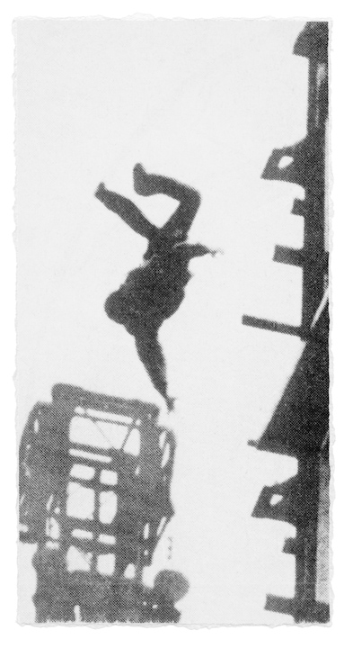 The show includes only one Still—the name Charlesworth gave to her monumentalized pictures of individuals plummeting to what most of the photographs more than hint was certain death. Unidentified Man, Unidentified Location (#3) (1980) shows what appears to be a construction worker falling, head first. Almost forty years later, after the events and iconography of September 11, 2001, such images read more dreadfully than ever. Unidentified indeed, I think; and divested of all humanity. But what if the appropriated picture is actually a production still, and its subject a Hollywood stuntman who—not unlike artist Yves Klein when he made that iconic leap into the void—landed safely on a tarp? The artist increasingly favored such uncertainty, an escape that her other Stills disallow.