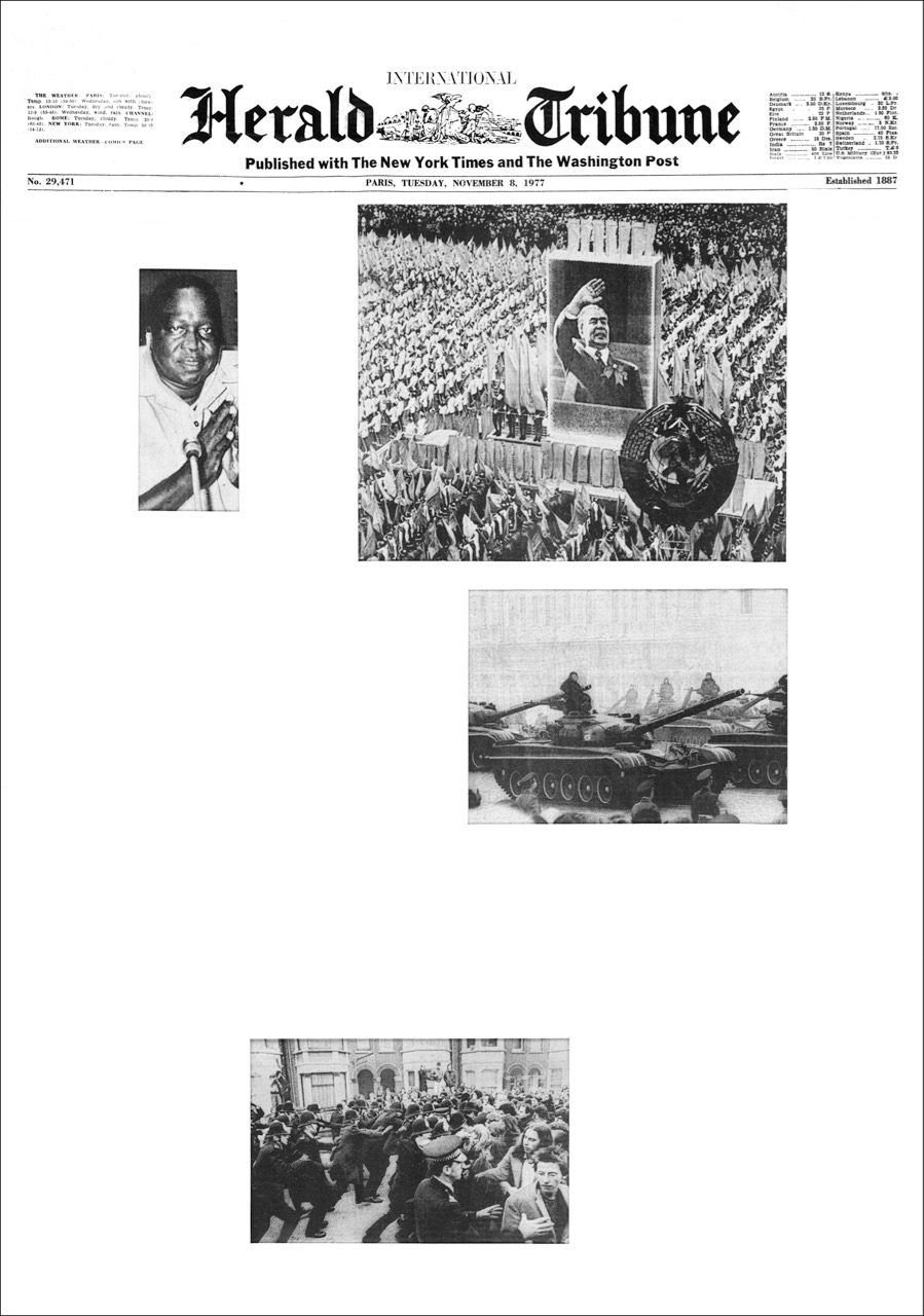 Appropriation, deconstruction, and the critique of representation: these are the quintessential postmodern strategies I discovered in the pieces now on view at Paula Cooper. One finds all three at play in her Herald Tribune, November 1977 (1977), a work that epitomizes Charlesworth’s austere, early photo-conceptualism. Occupying the length of a spacious gallery, the piece comprises twenty-six panels. Each shows a full-sized picture of the newspaper’s front page from a particular day in November 1977, from which Charlesworth hand cut all copy before reassembling the layout, using only pictures and masthead, and substituting white space for the excised text. Cut up and reassembled to reveal latent meaning, Charlesworth’s front pages are models of deconstruction. Stripped of accompanying text, the images tell a distilled story of what made news in 1977, and arguably still does: white men, dictators, and the occasional royal.
