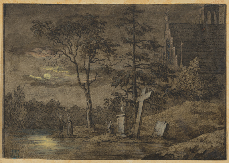 Nature that represents nothing but its that-ness, its there-ness; the bare fact of its existence—like the generic specimens in Plant and Tree Studies (June 28, 1799), renderings in pencil, gray ink, and wash on paper that wouldn’t be out of place in a naturalist’s field notes—is rare in Friedrich’s corpus. More often than not, his landscapes are allegorical, littered with symbols. Figures Contemplating the Moon (ca. 1797–99), an early work in watercolor and ink, is a prime specimen: a lovers’ tryst on the edge of a moonlit lake is counterpointed by a mourner overcome with grief in an untended graveyard, its funerary monuments and headstones off-kilter and crumbling. These vignettes make Joanna Sheers Seidenstein (who, along with Alison Hokanson, curated the show) think of “the Sturm und Drang movement and sentimental literature in which moonlight plays both a symbolic and an atmospheric role,” specifically Goethe’s novel The Sorrows of Young Werther (1774), in which the protagonist’s lover Charlotte declaims, “Whenever I walk by moonlight, it brings to my remembrance all my beloved and departed friends, and I am filled with thoughts of death and futurity.”