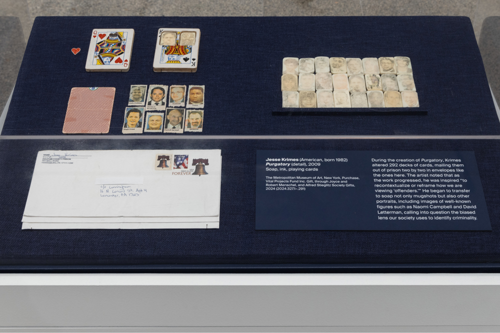 Limited by regulations on time, movement, and materials, Krimes realized he could hide the soap bars in card decks to prevent them from being ascertained by prison authorities. He mailed the decks out of the institution two at a time, in standard white envelopes. We glean, then, that Purgatory’s current display is a distortion of the original work, which was defined as much by temporal constraints as material ones. The original revealed itself in sequence through a process that first began with the sender, then required each letter to pass inspection by the jail’s internal processing department, depended on the United States Postal Service for transportation, and finally reached completion upon delivery to the addressee. Postmarked envelopes are shown in a vitrine in the gallery. Did the museum choose to include it as an explanatory accessory, a kind of anthropological, carceral ephemera? Or is the envelope a work unto itself, a remnant of Krimes’s process-based practice? This tension—between institutional contextualization and artistic agency—is a recurring problem throughout the show.
