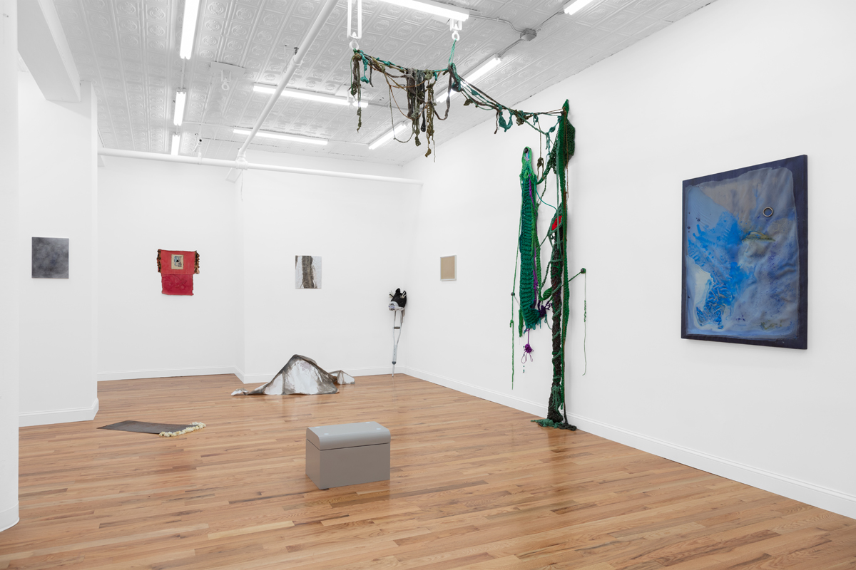 Behind abstract forms, installation view. Courtesy Fragment. Pictured, from left to right, against left wall: Sheila Pepe, In advance of a garden, 2023; Hayden Dunham, winged condensation, 2021; Shikeith, grace comes violently, 2022. Center foreground: Gordon Hall, Closed Box (Grey and Blue), 2021. Far right: Quay Quinn Wolf, Untitled, 2022.