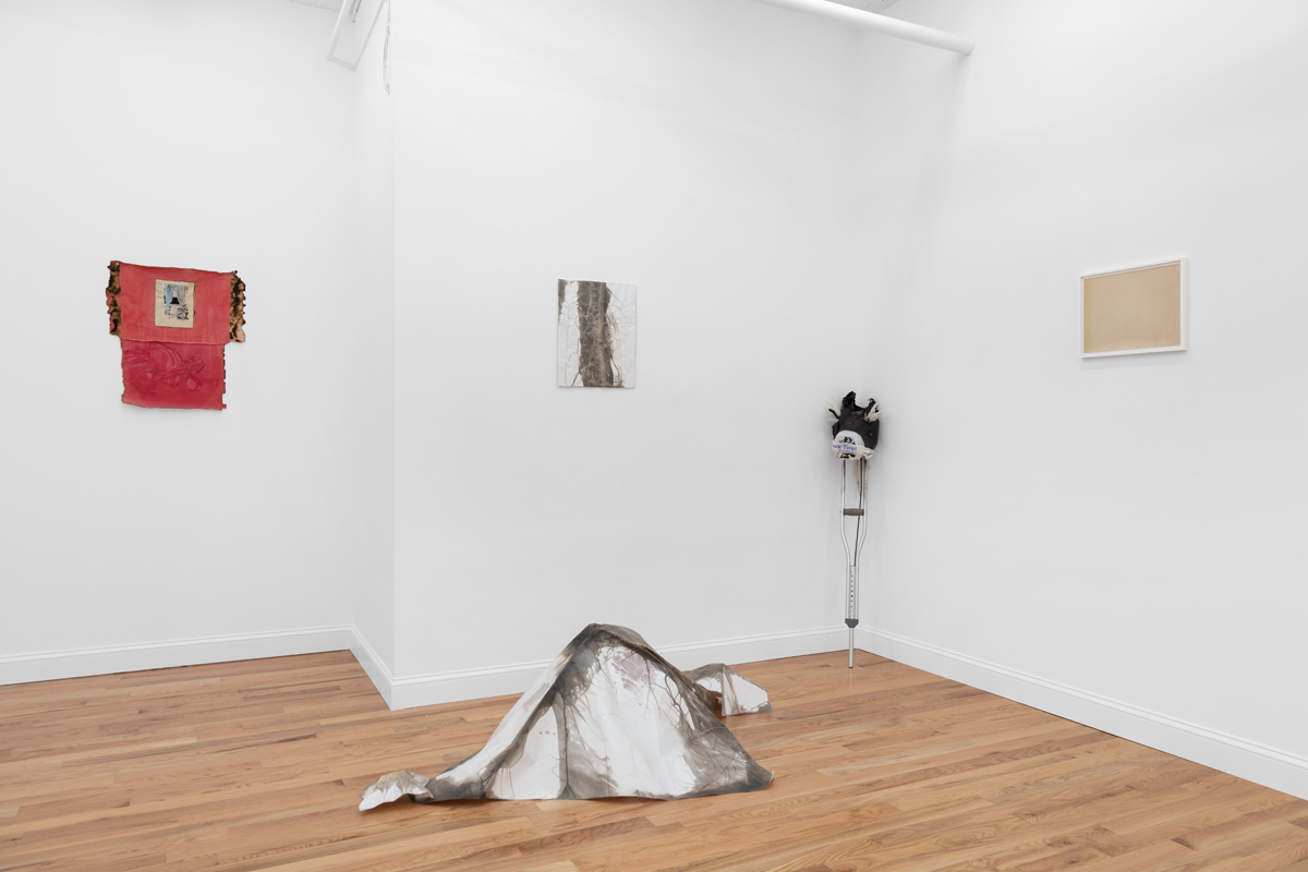 Trauma or loss is invoked most explicitly in two works by Quay Quinn Wolf. For one, the artist has pulled a length of tanned leather taut over stretchers. Stained, cloudy, and creased, its surface nicked and punctured, the pebbled hide’s botanical fragrance—a suggestion of care—counters macabre connotations. (Essential oils are listed as a material.) The skin does not evoke a corpse, but a body marked by inevitable injuries, imperfections, or past violence.
