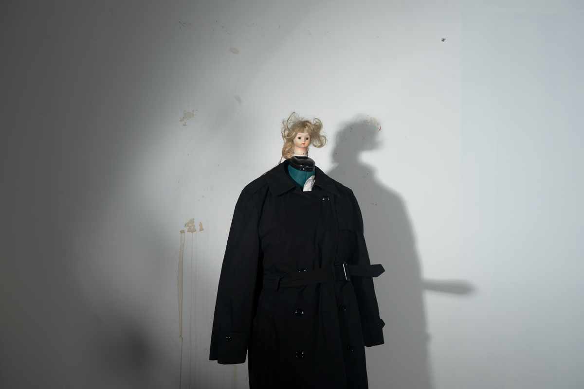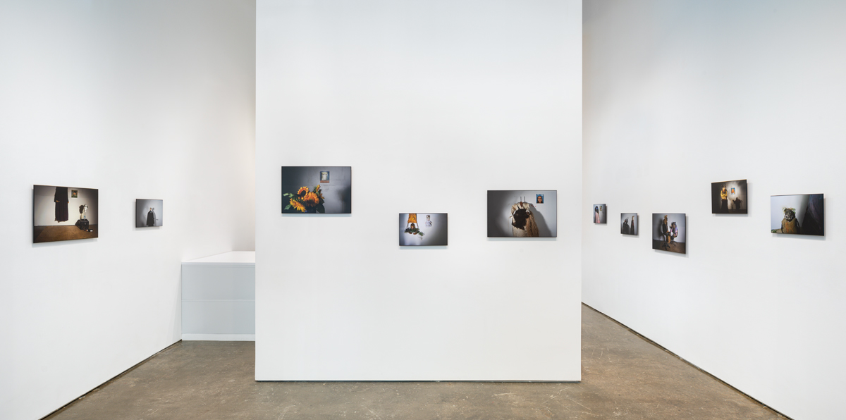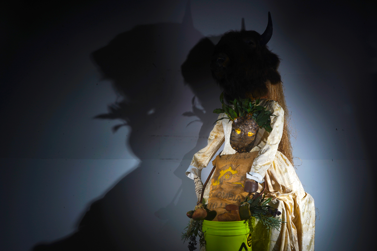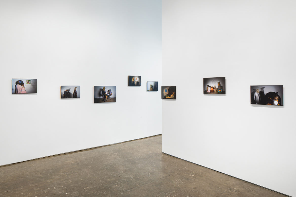 Dead animals, disassembled into pieces, are a heavy presence in Linnaeus After Dark (as the 2022–23 series is titled), despite its sense of play. Whimsy and foreboding cross-fade in the shifting gloom. Hung at a range of eye levels in a wavy line around the compact gallery, the tragicomic interior scenes suggest an improvised mythic world—and a photo shoot of extremely scant resources. I imagine tilted table lamps, or work lights clamped to chairs, their weak beams carefully angled to achieve Pentecost’s range of low-tech effects. Distorted and amplified shadows have an outsize graphic and dramatic power, lending an etheric, metaphysical dimension to her yard sale– or garbage heap–sourced characters and sets. A makeshift staging of a fable, like a children’s play produced in a basement, comes to mind when, for example, in Ritual Evaluation, a bipedal coyote in a floral fast-fashion smock dress turns away from a legless, one-horned, bucket-masked creature slumped in an office chair. Pioneer Cemetery, on the other hand, is more in the spirit of Halloween. A decapitated frontier woman wears a gown of white damask, holding in her arms not a human head but one once attached to a beautiful bison.