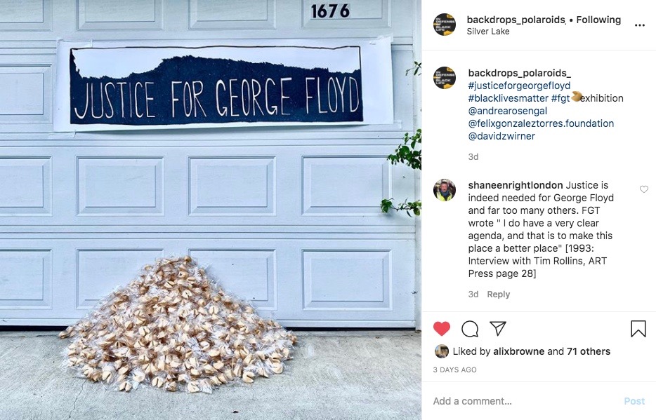 Felix Gonzalez-Torres, “Untitled” (Fortune Cookie Corner), 1990. As installed by Gary Simmons, garage of a friend’s home, Silver Lake, Los Angeles, CA, USA. Screenshot of Instagram post. Photo: Russell Salmon, May 31, 2020.