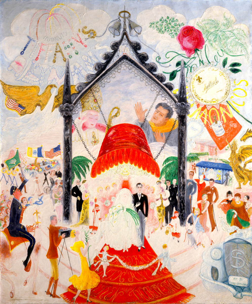 Reading Bloemink’s expert interpretations, paintings familiar to me—like the 1915 nude self-portrait that adorns the book’s jacket, or Stettheimer’s winking updates to the fête-galante genre—take on fresh, or more pointed, significance. If I had discerned in the past an amused disdain for high-society ostentation in Stettheimer’s depiction of the nuptials, center-stage in Cathedrals of Fifth Avenue (“Tiffany’s” is spelled out with jewels in the heavens above), I had somehow missed the significance of the composition’s bold white void: a spectral bride with fuzzed-out features holding a funereal bouquet of drooping calla lilies. It’s a reminder that, to Stettheimer, marriage was not simply unnecessary—it was a ritual of female obliteration or death. Maybe this is the unspecified “portent” that McBride hinted at, and nine decades later Bloemink can at last make perfectly clear.