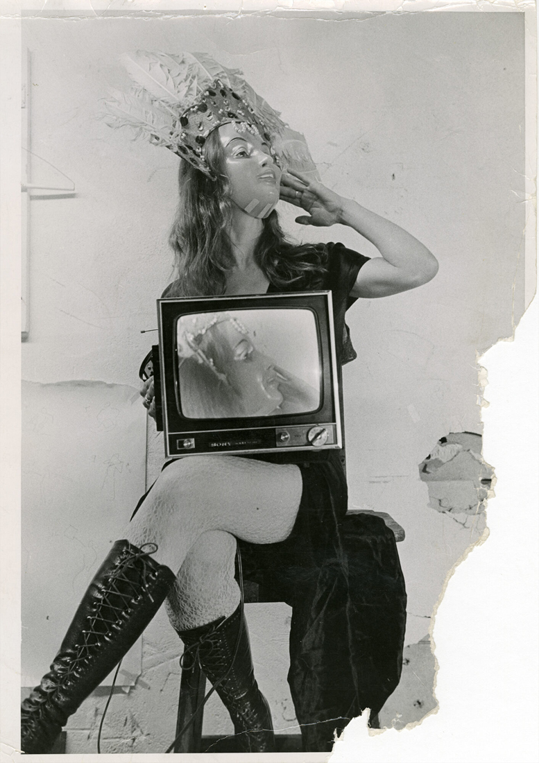 The landmark 1972 tapes Organic Honey’s Visual Telepathy and Vertical Roll are exhibited as discrete works as well as emblems of a new field of inquiry related to live feeds and performance. Among the materials assembled are a script, event announcements, costume elements, and a camera trained on a dog drawing, showing it as both a sheet of paper and as a static stream on a bulky monitor. From this mix, Jonas’s famous alter ego, the seductress Organic Honey, emerges as a quasi-spiritual figure, ritualizing experiments in closed-circuit technology, testing its potential for fracture, glitch, recursion, and mirroring. This is Good Night Good Morning’s most intimate, enthralling section: the glamour of outdated equipment—the clamp-light and cathode-ray ambience—here heightens the reverberating radicalism of Jonas’s ahead-of-her-time deconstruction of gender, her exposure of femininity as a mediated, surveilled condition. The visual drama of what follows throws its understated presence into relief.