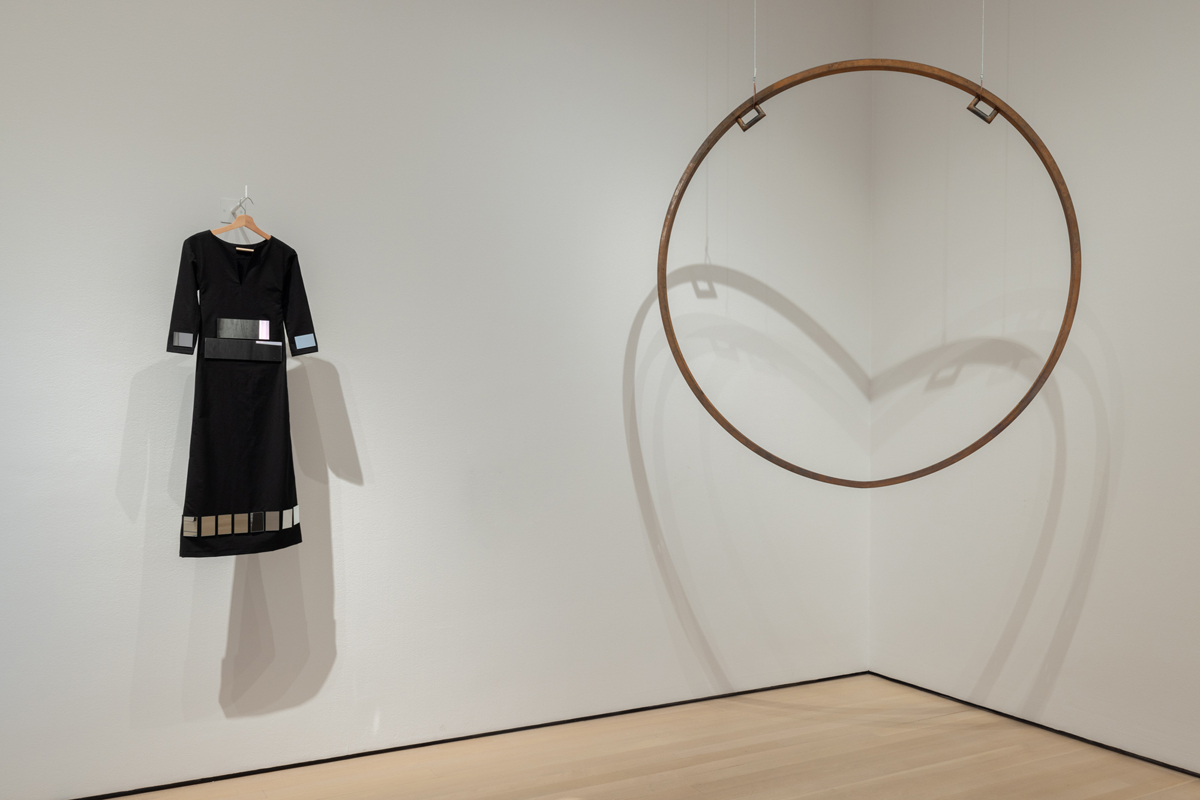 Joan Jonas: Good Night Good Morning, installation view. Courtesy Museum of Modern Art. Photo: Jonathan Dorado. Pictured, left: Mirror Dress, 1969–2024. Right: Hoop used in Delay Delay and Songdelay, ca. 1972.