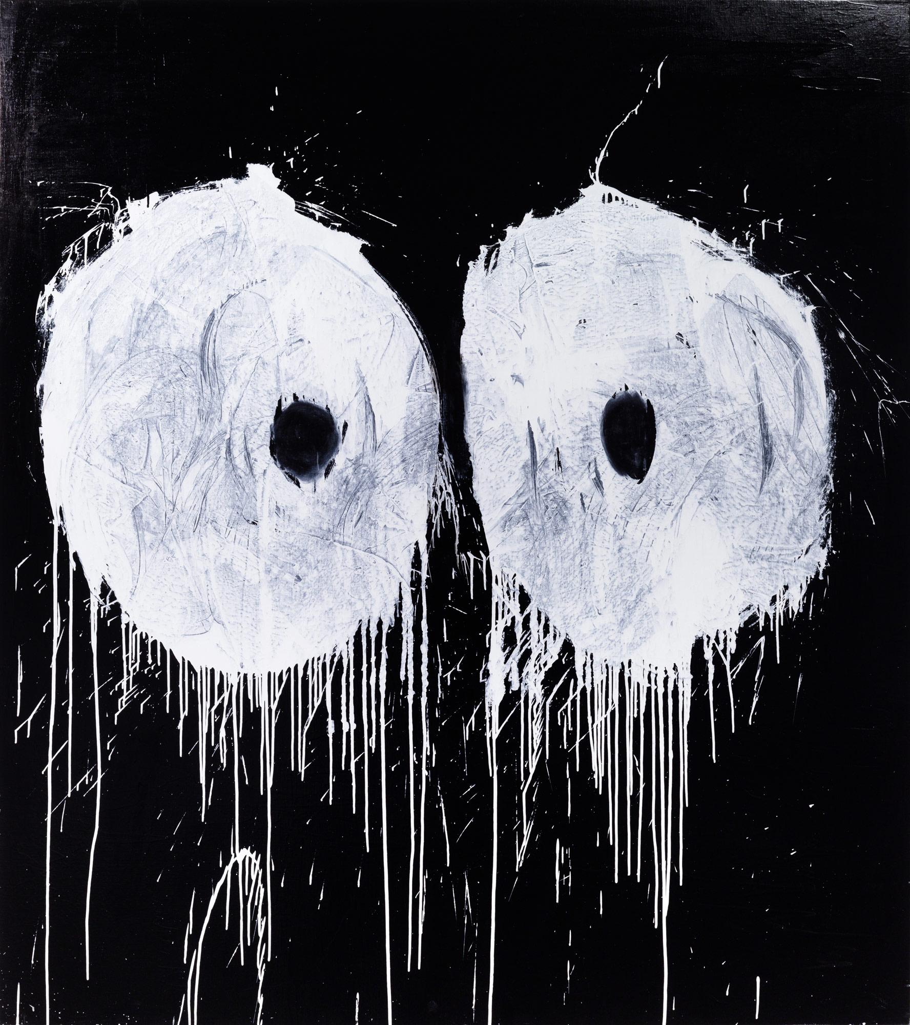 A stunning, unsettling group of her “eyeball” paintings, including the five-part work What’s Next (2015), prove that her addition of hardware-store enamel paint (a development she dates to 1989 or so) continued to produce breathtaking effects. In the stretch of grand canvases, the disembodied, but unmistakable, close-set white orbs that animate her cast of characters float in black fields. White paint drizzles from the goofy/scary doughnut forms in these stark statements, which look effortless, banged out. Jackson Pollock’s splattered expanses and Pat Steir’s rivulet curtains appear as representational techniques for graphic, branded imagery, stripped down to its expressive essence.