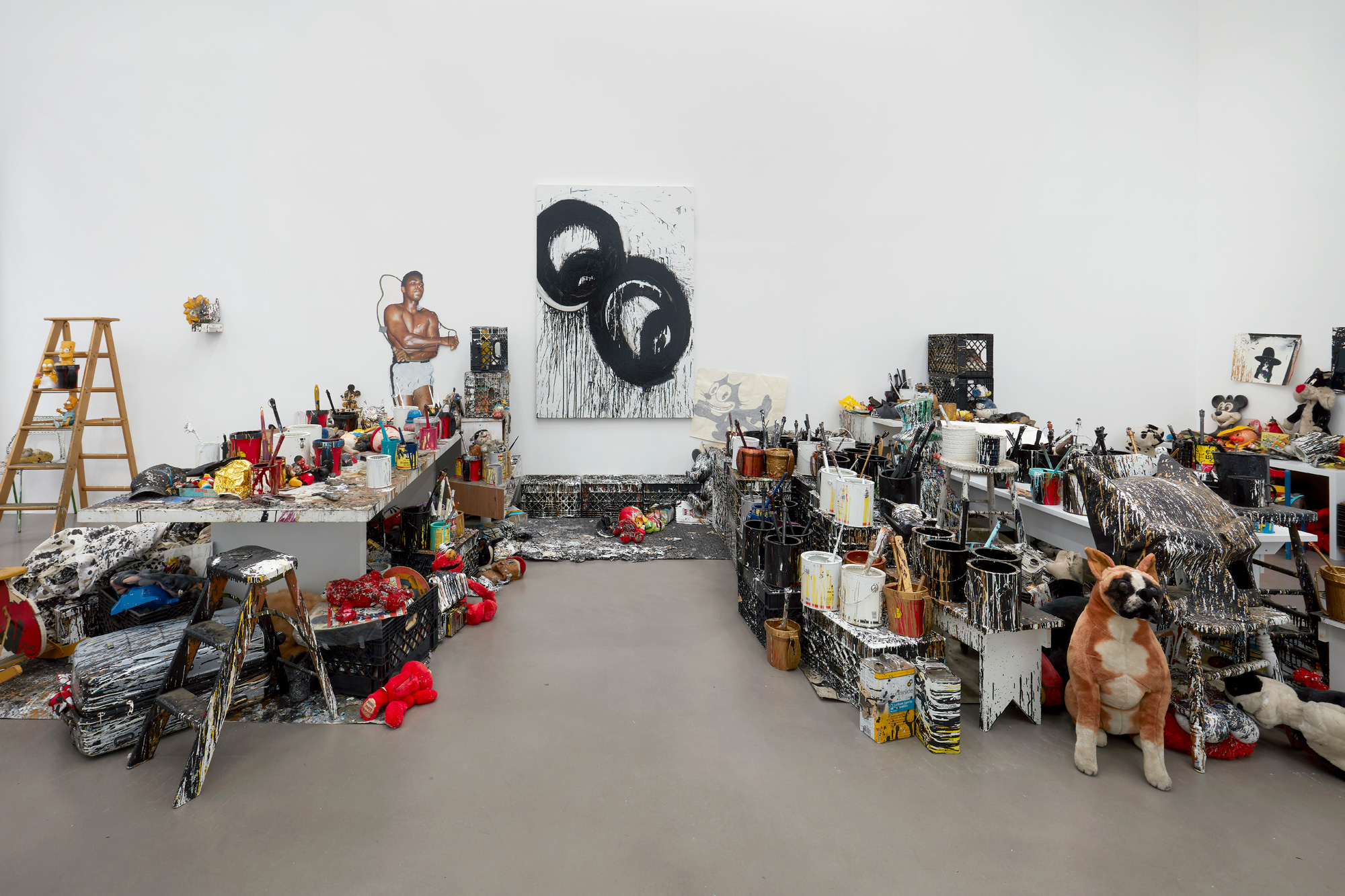 Pensato’s sprawling installation work Fuggetabout It (Redux), for which the Chelsea show is titled, sets the stage for all else on view. In 2012, when the artist was forced out of Joyceland, she transported its alarming, edifying contents to Petzel’s former space on Twenty-Second Street for an acclaimed deluge of a show, which felt part landfill, part crime scene. Here, her former studio’s islands of detritus and inspiration are deftly reconfigured once again. Scores of paint cans join legions of enamel-spattered photos and toys; artifacts of racist kitsch surface occasionally, neither hidden nor highlighted, presented honestly as part of American mass media’s churning guts.