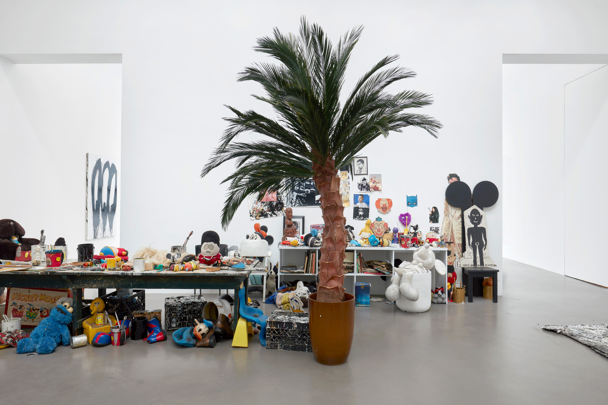 A Big Bird booster seat, stuffed South Park characters, a filthy plush Sylvester the Cat, and countless versions of Mickey and Donald offer a vision of Pensato’s process as one of slow metabolization, the production of messy composites rather than copies—even if the brushwork itself looks deliriously fast. Pulling back the curtain on her studio was a genius gesture, I think, and it’s exhilarating to see it again. The astounding accumulation of treasure and garbage, which luckily supplanted apples and pears, is a revelation when placed next to her still-vital, elegant late paintings.