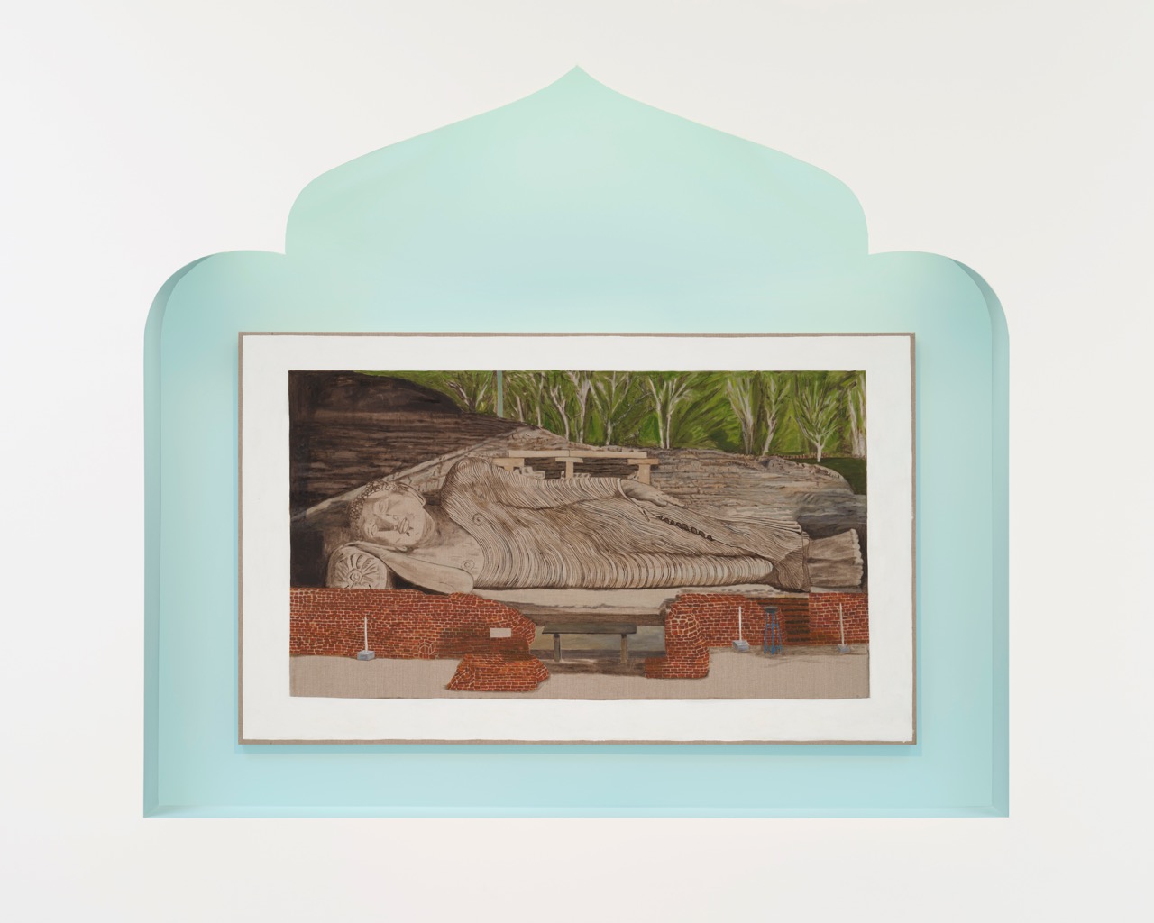 Leidy Churchman, Reclining Buddha, 2020. Oil on linen in niche designed by the artist, 48 × 79 inches. © Leidy Churchman. Image courtesy Matthew Marks Gallery. Photo: Aaron Wax.