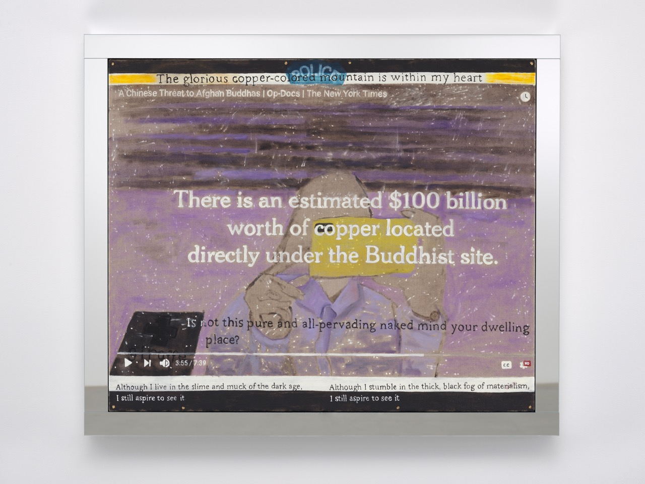 The hazy, purple and gold 100 Billion Sadhana of Mahamudra (2020) shows what seems to be a screengrab of a paused video on YouTube. In fact, we are looking at an ominous, dreamy composite: a still from a Times “op-doc” titled “A Chinese Threat to Afghan Buddhas,” which reports on the threat to Buddhist antiquities (from a Chinese mining company as well as the Taliban), is overlaid with an iPhone-holding figure and lines of text. It’s Trungpa again: “Although I stumble in the thick, black fog of materialism / I still aspire to see it.” (“It,” in the original text, part of a shifting refrain, refers to “the all-pervading naked mind,” among other related, poetic possibilities.) The layered painting is a despairing comment on global-capitalist rapacity and war. It also captures the particular kind of synthesis—and confusion—born of the easy and endless juxtapositions that the web affords. And it might recall, if you’ve ever sought meditation instruction, one of anxious thinking’s rapid crossfades that becomes particularly vivid as you try to let thinking go.