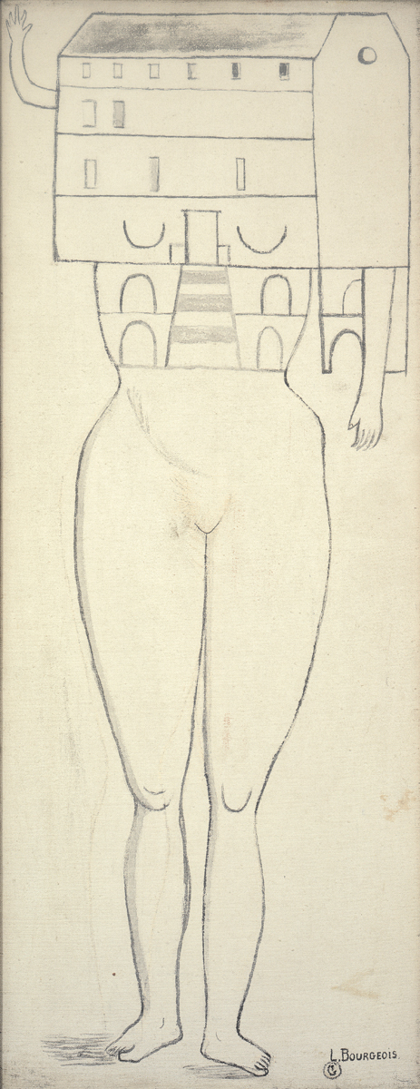 Paintings might be seen as a prequel, showing us a Bourgeois less conscious of her unconscious, her grasping reflected in palimpsest-like surfaces and psychological self-portraiture. Here, in the strange, voyeuristic views of architectural interiors as bloody, internal spaces, and building façades as bodies with limbs and orifices, there are hints of her epic scope. Such compositions seem forerunners to series such as her room-size Cells, which were, at the time she made the two-dimensional works here, decades away. The emergence of feminism’s second wave was distant, too, but its fresh context would lend the fundamental themes of the artist’s work—family, motherhood, the domestic realm—a new place in culture. Eventually, the personal would come to be understood as political, as well as (at least for Bourgeois), the stuff of a heroic mythos and a proper subject for Maman-scaled art.