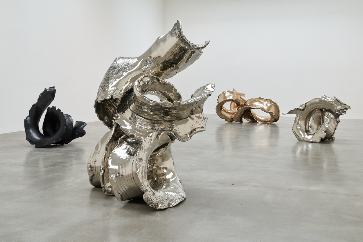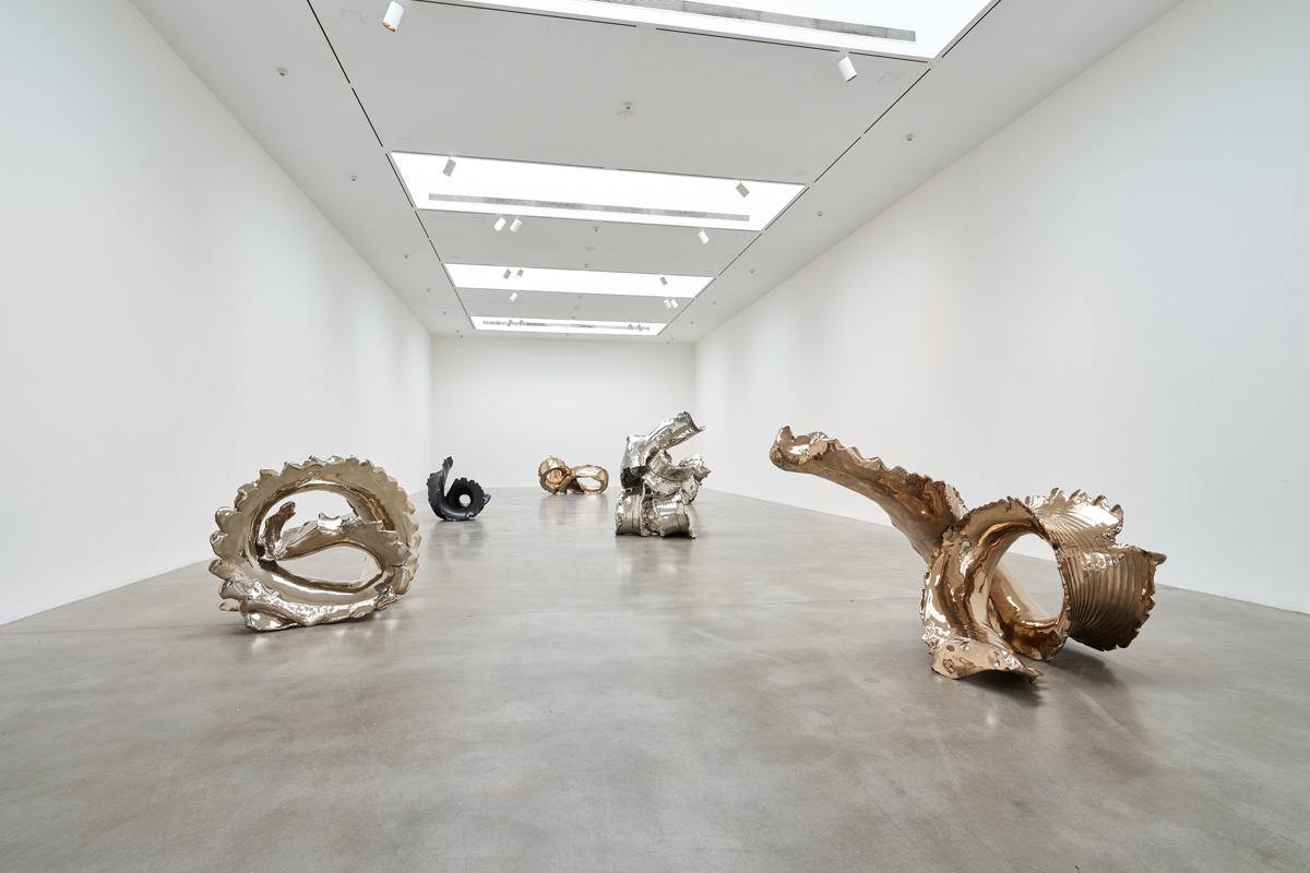 Lynda Benglis: An Alphabet of Forms, installation view. Silvery sculpture pictured in foreground: Lynda Benglis, Power Tower, 2019. White Tombasil bronze, 89 × 64 × 72 inches. © Lynda Benglis. Courtesy Pace Gallery.