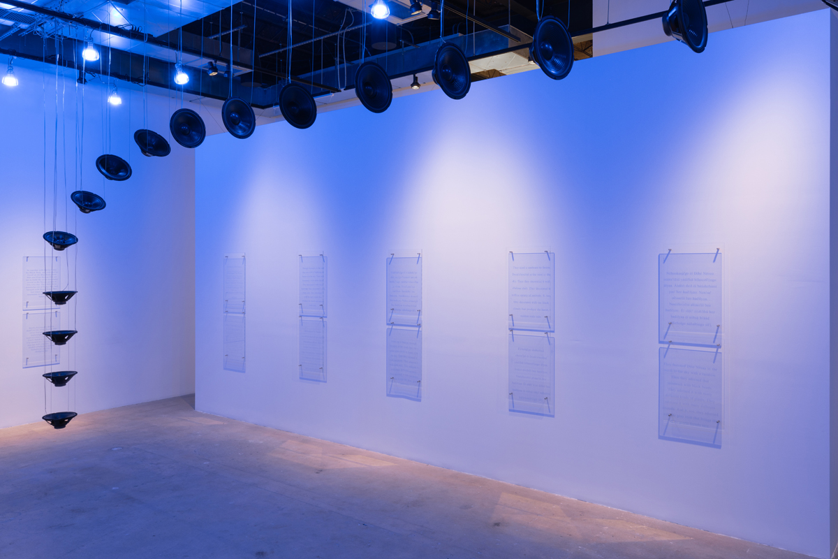 Raven Chacon: A Worm’s Eye View from a Bird’s Beak, installation view. Courtesy Swiss Institute. Photo: Daniel Pérez. Pictured: Still Life No. 3, 2015. Glass panels engraved with text, aluminum mount spacers, speakers, stereo amplifiers, stereo delay unit, audio track, and color timed-LED light arrays.