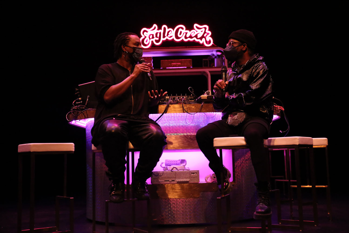 Sadie Barnette: The New Eagle Creek Saloon, installation view. Pictured, Shaun J. Wright and madison moore, Saturday Sessions event, 2022. Courtesy the Kitchen. Photo: Paula Court.