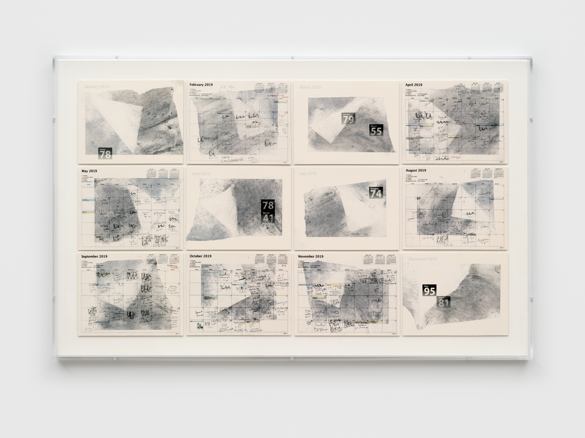While these artists’ evocations of flesh provide a foil to the technologically mediated, deconstructive approaches to the body of younger generations (such as the 3D-printed CAT-scan assemblages by Jes Fan and the stark, fragmented figurative sculptures by Julia Phillips), a piece of subtle power by Mary Kelly, born in 1941, stands as a precursor to the show’s thread of more conceptual endeavors. Lacunae (2023) is a grid of calendar pages, annotated and rubbed with ash to mark the deaths of friends over the course of a decade, its form hearkening back to Kelly’s Post-Partum Document (1973–79), a landmark of feminist rigor and the women’s art movement, which dispassionately tracked the growth of her son. In the same room, Sharon Hayes—once a student of Kelly’s—invites viewers to pull up a chair, as though to join her filmed conversation between queer and trans elders, and Carolyn Lazard—once a student of Hayes’s—shows a miniature hall of mirrors, a Minimalism-spoofing maze of Vaseline-filled bathroom cabinets, fraught with domestic and bodily associations. In a different gallery, Carmen Winant, whose work calls back to both Kelly’s indexical approach and her unlauded subject matter, shows The last safe abortion (2023). Winant has filled a wall with a kaleidoscopic grid of 2,700 archival photographs, a Herculean paean to clinics and their workers, and a meticulous mourning of a human right.