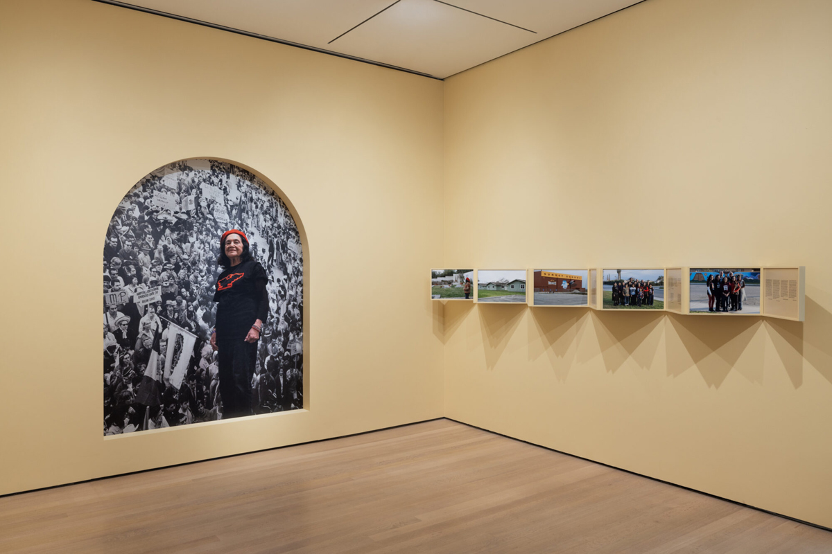 LaToya Ruby Frazier: Monuments of Solidarity, installation view. Courtesy Museum of Modern Art. Photo: Jonathan Dorado. Pictured, left: Dolores Huerta Standing in front of Harvey Wilson Richards’s Photograph of Grape Pickers, Farm Workers, Community Members, and Supporters on their 340-Mile Peregrinación (Pilgrimage) from Delano to the Steps of the State Capitol in Sacramento, March–April 1966, in the Exhibit Hall at the César E. Chávez National Monument (Nuestra Señora Reina de la Paz), Keene, CA from A Pilgrimage to Dolores Huerta: The Forty Acres, Arvin Migratory Labor Camp, Nuestra Señora Reina de la Paz, Dolores Huerta Peace and Justice Cultural Center, 2023–24.