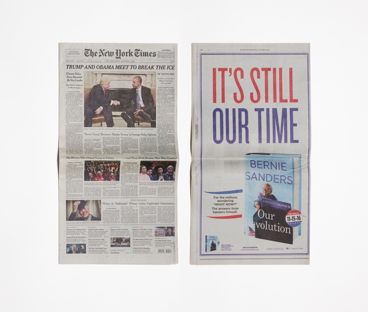 Taryn Simon, The New York Times, Friday, November 11, 2016 (front and back view). New York Times newspaper in glass display cabinet, 22 × 12 ¼ × ⅜ inches. Image courtesy the artist.