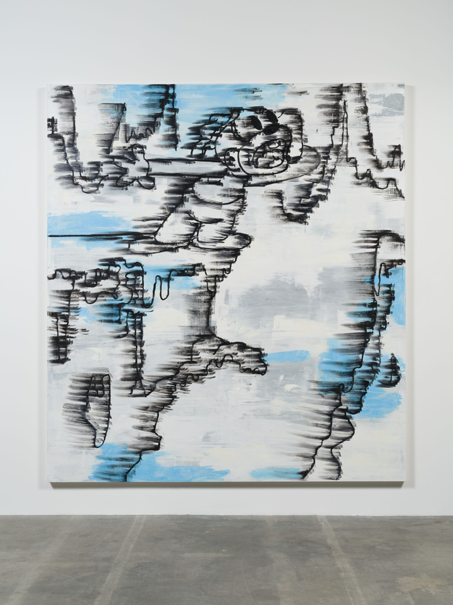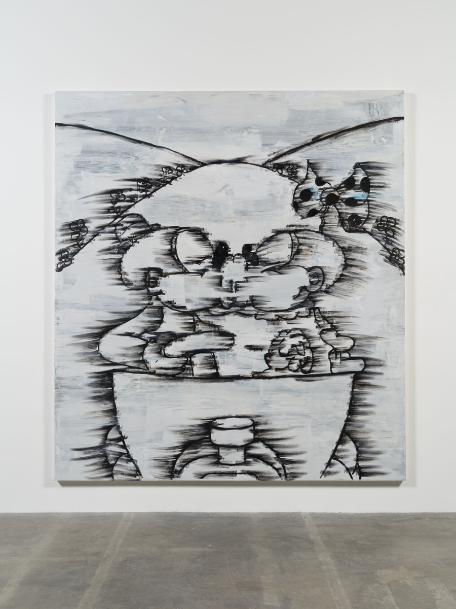 Throughout his decades-long career, Simmons has frequently appropriated such animated imagery precisely because it passes unnoticed so frequently, its soft-power ideologies delivered in apparently innocuous form and guise. The artist does so again in this installation, where a number of large canvases feature Honey and Bosko, two cartoon characters from the 1930s, famous in their day, variously playing guitar, clarinet, or saxophone, and singing in the tub or from the mountaintops. In each instance, Simmons employs what has become the artist’s signature process, delineating the contours of the cartoon image before dragging his hands or arms across the still-wet rendering, which blurs and obscures the picture while making it ambiguous and ethereal: a “ghost,” as he puts it, speaking to how such forms endure even when unseen, effectively haunting our cultural space.