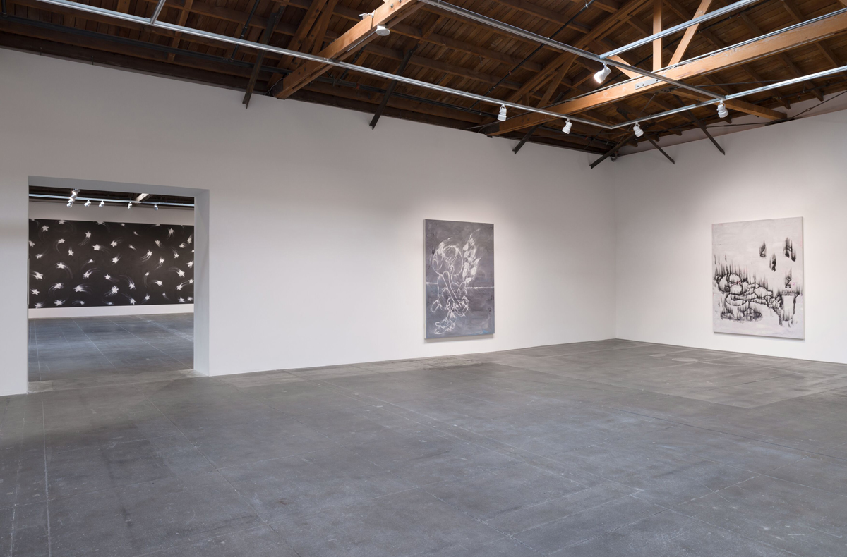 Gary Simmons: Remembering Tomorrow, installation view. Courtesy Hauser & Wirth. Photo: Jeff McLane. © Hauser & Wirth. Pictured, left: Gary Simmons, Star Chaser, 2022. Pigment and oil paint on wall, 144 × 519 inches.