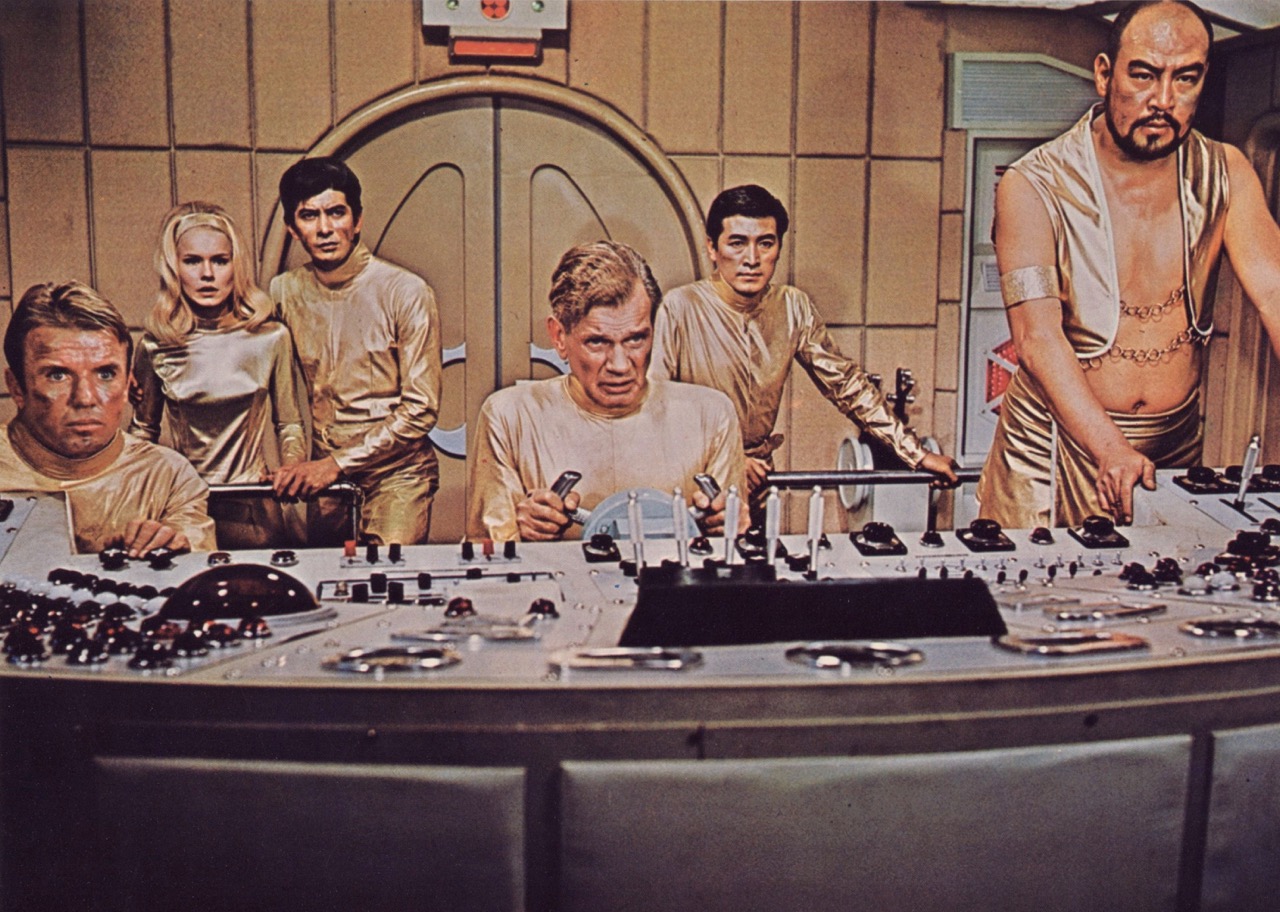 In contrast, Honda-Tsuburaya’s vibrant, campy aquatic adventure Latitude Zero (1969) dives into spectacle, employing copious use of analog effects, miniatures, and monster suits, shot primarily on soundstages decorated with boxy, blinking computer panels and groovy comic-book colors. The look is very Barbarella-on-a-budget, and as with Roger Vadim’s film (released the year prior), Latitude Zero is an international production, shot in English in Japan with American and Japanese actors. Aging Hollywood leading man Joseph Cotten, then past sixty, plays McKenzie, the two-hundred-year-old captain of the wondrously Jules-Verne-esque submarine Alpha, commanding his ship while decked out in a queeny ensemble of puffy-sleeved jacket over bare chest, accented with a wispy, lime-green neck kerchief. McKenzie and his crew deliver a trio of rescued bathysphere researchers to the undersea city of Latitude Zero, where many of the world’s top scientists have fled to live in a perfectly rational society devoid of money, crime, and mortality, thriving beneath the rays of an artificial sun. “Politics are only needed by people incapable of running their own lives,” Cotten’s character explains, as an eternally youthful Latitudian in gold-lamé jumpsuit bounces giddily on a trampoline behind him.