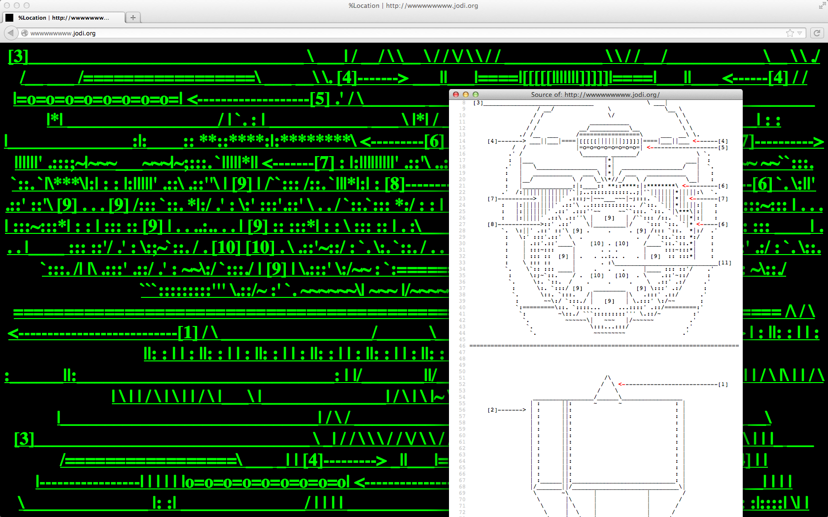 One of their most infamous pieces from that period, located at http://wwwwwwwww.jodi.org (1995), offers a perverse form-content reversal on its first page, which appears to the reader as nothing but a green garble of numerals and punctuation marks. View that page’s source, however, and you will discover that this seemingly nonsensical pattern has been generated by inserting ASCII drawings of hydrogen bomb blueprints into the body of the code, forcing the browser to misread the characters comprising these images as if they were lines of HTML. If the goal of the internet is to facilitate the spread of information, the transformation of an ordered diagram into a disordered jumble of text immediately blocks communication’s path. “The work we make is not politically oriented,” Heemskerk told interviewer Josephine Bosma on the Nettime listserv in 1997, “except that it stands in the net like a brick.”