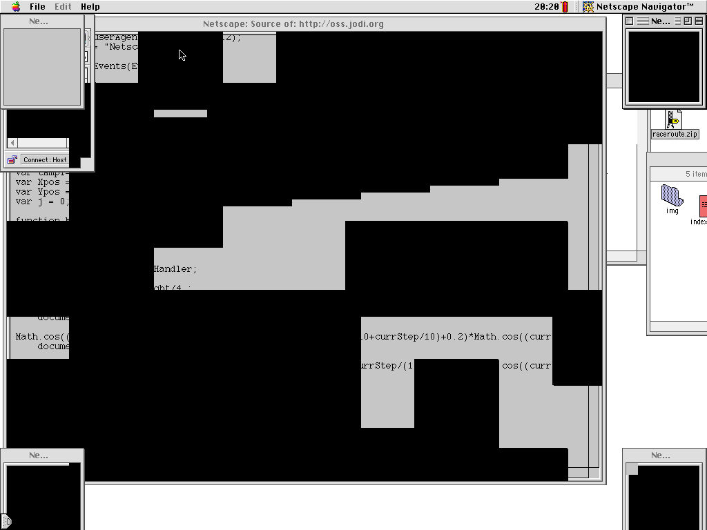 This is perhaps why one of JODI’s most enduring works, a minimal site located at http://oss.jodi.org (1998), remains unsettling. Once again, JODI encoded this page to make it seem as if it had a mind of its own, but in a manner that violently transforms the normal configuration of a web browser. The page initially loads as a featureless expanse of black background, then suddenly conjures a swarm of tiny pop-up windows, each little square careening haphazardly across the breadth and width of the desktop, brazenly ignoring the browser’s normal boundaries and halting nearly all actions if the user cannot determine how to stop the onslaught. There’s also a bit of topical reference: by the turn of the millennium, one of the most pernicious annoyances of the internet were pop-up ads, appearing most dramatically via what would come to be known as the “pornado” effect of sex-site advertisements. For this reason, oss.jodi.org will not always function properly today, since many browsers are set to block pop-ups, and such intrusions cannot occur at all when browsing on a phone or tablet OS.