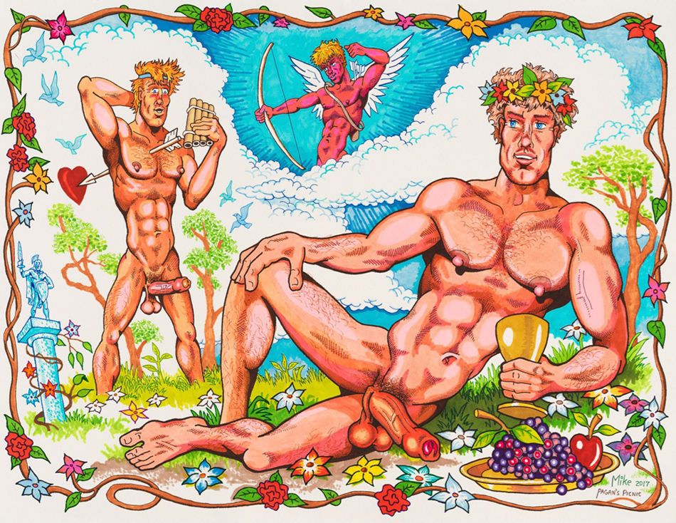 Here, in a show simply titled Drawings by Mike!, are twenty-two neatly framed ink-and-felt-tip-pen cartoons of tousle-haired Caucasian bohunks engaged in a variety of joyously, nakedly homoerotic situations: skinny dipping, crotch grabbing, pec rubbing, tit sucking. Their bare asses are, without exception, spheric and shiny, like the juiciest apple you’d ever hope to bite. Their sparkling eyes appear glazed over, staring into daydreams even as the men lick and paw at one another’s brawny bodies. Their expressive dicks are thick and veiny: some half-tumescent flesh-tubes flop lazily downward; others stab at the air, yearning toward some object of desire, dribbling semen like a salivating predator.