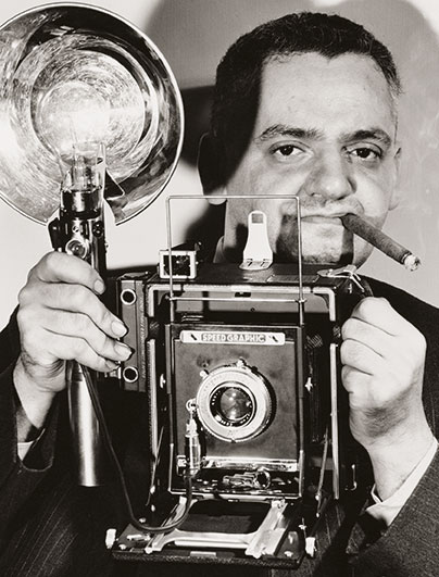 Weegee, Weegee with his Speed Graphic Camera, ca. 1944. From Naked City, page 10. Image courtesy Damiani Editore and International Center of Photography.
