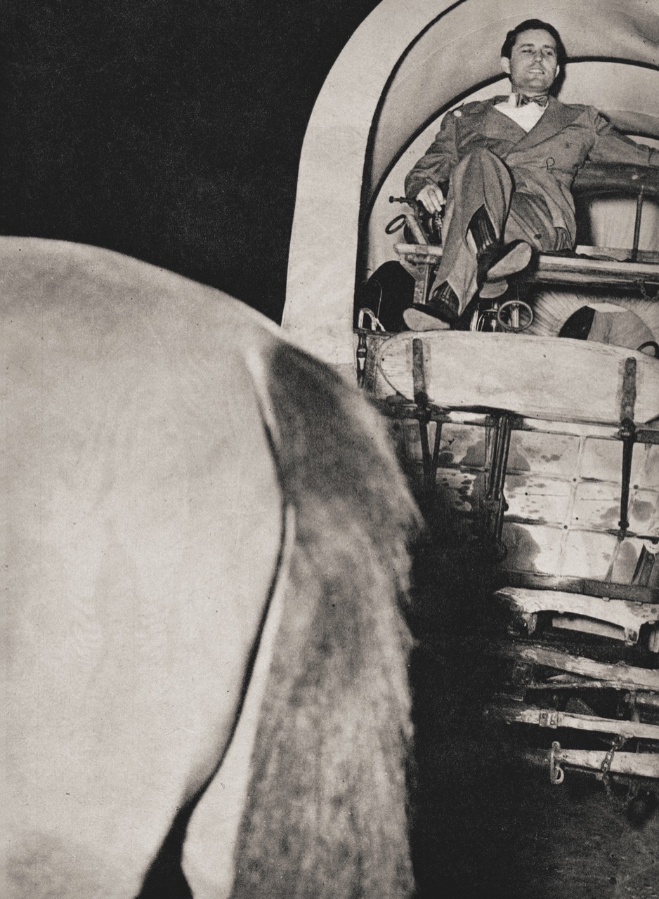 This knife-edge balancing of vitality and morbidity is economically expressed in Weegee’s penchant for generating gallows humor through visual juxtaposition, as in his picture of firetrucks dousing a burning building whose painted facade reads “SIMPLY ADD BOILING WATER,” or another of a man sleeping like the dead on the pavement outside a funeral home’s entrance. A related effect is achieved in a snapshot of right-wing politico and Nazi sympathizer Joe McWilliams; captured while riding a horse-drawn carriage, McWilliams’s portrait is dominated by the leftward intrusion of a massive horse’s ass. This is why we once again need Weegee, an unsubtle artist for unsubtle times.