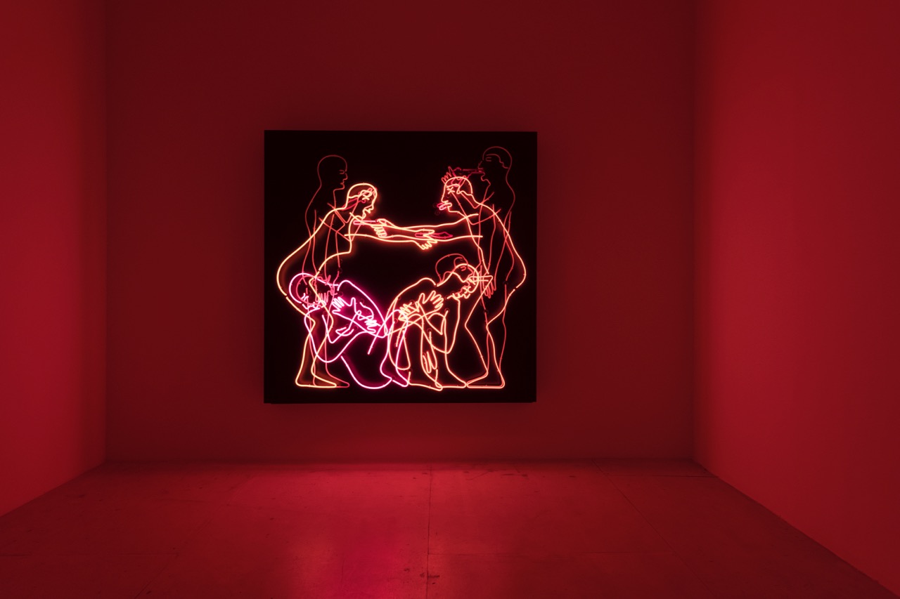 On display in a darkened room at PS1, with the rainbow colors diffusing across the walls and ceiling as it flickers like an inappropriate holiday decoration, Seven Figures is easily the most unselfconsciously beautiful piece in the show. It’s also, by virtue of its materials and explicit subject, in wonderfully bad taste—the shock value must have been gigantic in 1985; figurative work alone was déclassé then, let alone figures fucking.