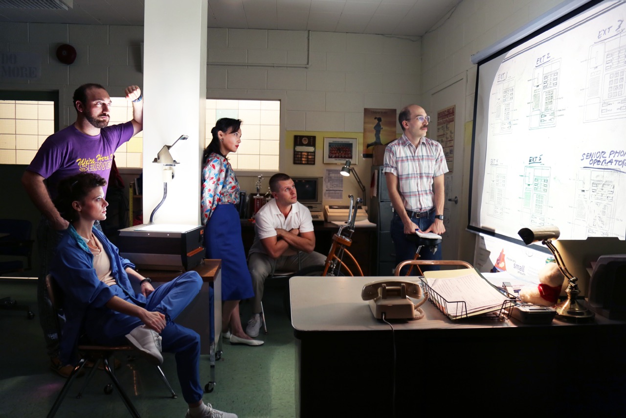 This vague directive, printed on a dot matrix printer, soon joins many other hackneyed maxims on the walls of the set (which Amy Rubin has assembled with painstaking attention to the minutiae of old-time secondary education, down to a functional 1980s model computer). What we learn about these characters beyond their function as committee members comes only by inference—that Julie and Ken are a married couple, that Sandra is single, that Ken is in therapy, that Brenda’s accident may be causing her to abuse painkillers, that Rod thinks Julie and Ken’s marriage is in trouble. We figure these things out while on the surface, the six of them attempt to decide, for example, what the theme of the telethon should be: “Around the World” (a theme they have already used twice), “A Knight to Remember,” “Clear the Hurdles (of Life),” “Hollywood Through the Ages,” or the ultimate winner, “Traveling Through Time.” Have you fallen over from boredom yet? Well, as a committee member might say, hold your horses, there, buddy.