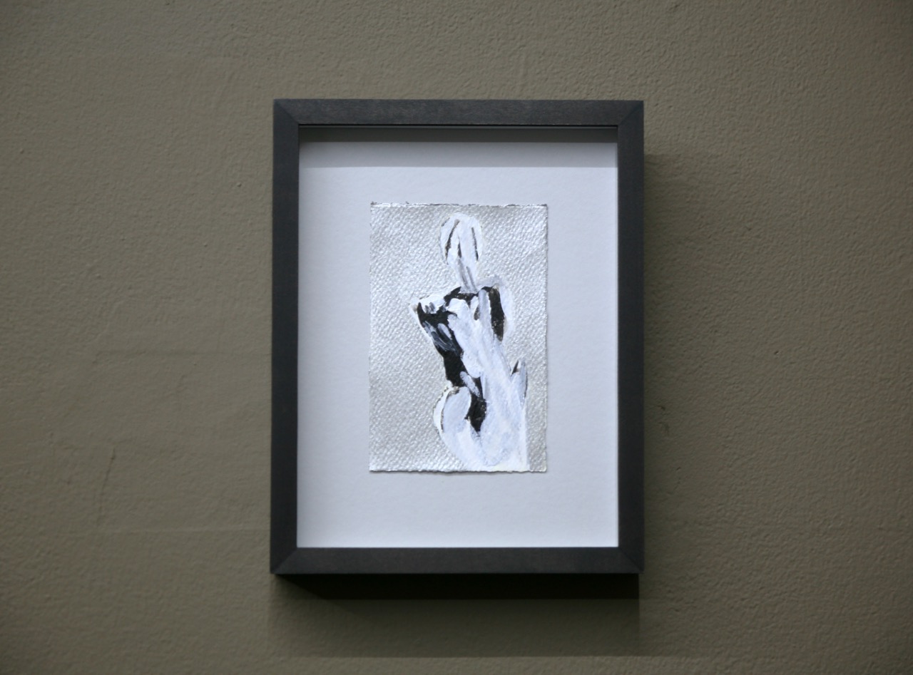 The hourglass figures in the frames look as if Davis might have painted over photographs of these cinematic icons, but photographs are not included in the materials lists. And quite the materials lists they are! Davis has painted her constructions on watercolor paper with nail varnish, pomade, glycerin, hair spray, mascara, eyebrow pencil, Jean Naté perfume, and Afro Sheen hair conditioner. I’ll admit that I tried to smell them through their frames, and sadly could not even get a faint whiff of Aqua Net. But what fragrances they must have!