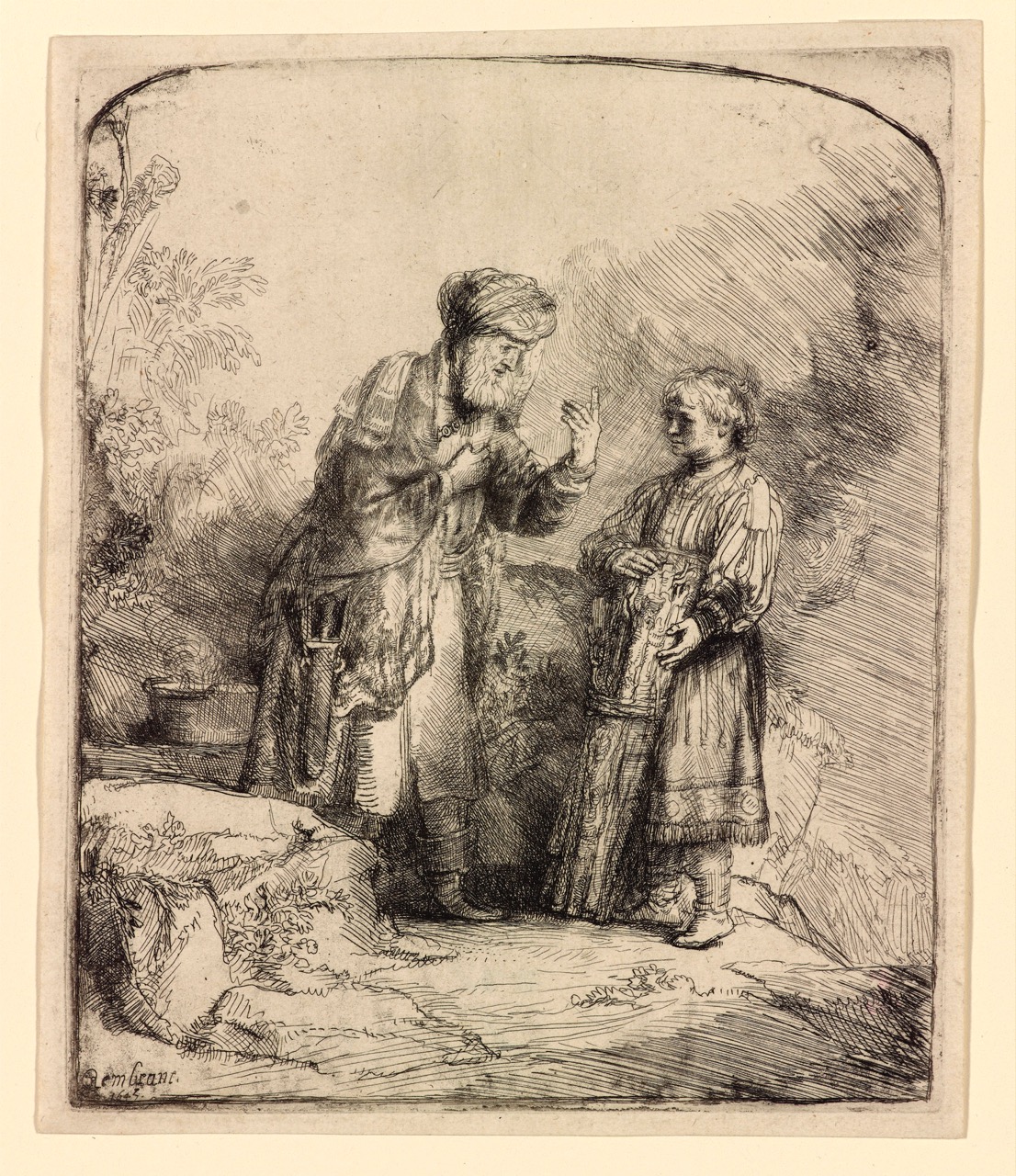 Rembrandt, Abraham and Isaac, 1645. Etching and burin, state i/ii, 6 ⅛ × 5 ⅛ inches. Photo: Morgan Library & Museum.