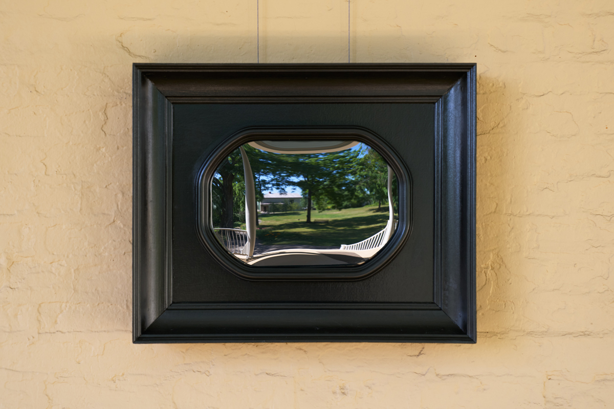 It is the 199th anniversary of Cole’s first trip up the Hudson, and this work matters in this place because place holds meaning, and those meanings spiral through time. I only wish Native Prospects could be larger, could be someplace like the Met, which only in 2017 started to include Indigenous American work in the American Wing. There isn’t enough space at the Cole site, and being small risks essentializing Indigenous takes on the landscape, a bit like Cole and his compatriots making Indigenous people nothing but nature. In our climate-crisis era, many have elided Indigeneity with a relationship to nature and place, as if these worldviews hold the answers. It is a seductive mistake when we—me included—are eager for ways forward. On the porch in the mirror, I see blue sky and billowing clouds—and myself. I see a white person of European ancestry longing to belong to a place.