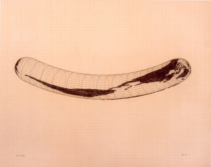 Agnes Denes, Isometric Systems in Isotropic Space–Map Projections: The Hot Dog, 1976. Ink and charcoal on graph paper and Mylar, 24 × 30 inches. Image courtesy collection of Gail and Tony Ganz.