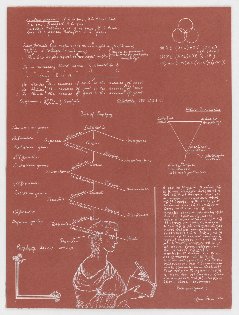 Spread across the building’s two primary exhibition galleries and featuring more than 150 works, the exhibition is demanding—so much so that at times it threatens to overwhelm viewers with its complexity and density. Thankfully, curator Emma Enderby organized the show around a series of rubrics that gather Denes’s assays into more easily digestible sequences without reining in their restless diversity. The first two of these, “The Philosophical Drawings” and “The Map Projections,” are by far the most intricate, their welter of works on paper concerned with, in the words of the artist’s 1969 manifesto, “defining the elusive / visualizing the invisible / communicating the incommunicable.” Animated by a kind of endlessly enthusiastic intellectual and makerly horror vacui, the first decade-and-a-half or so of Denes’s career is a blizzard of diagrams, illustrations, sketches, and charts that conjure, among a great many other things, the Earth isometrically transformed into an egg, a doughnut, a snail, and a hotdog; a comparison of the evolution of the human body and of machines, tools, and weapons; thought processes visualized in terms of crystallography; a “matrix of knowledge” that “anticipates a future in which . . . information will be dehydrated and coded for storage”; the “scale of being” proposed by the Neoplatonist philosopher Porphyry; linguistic cut-up experiments made by feeding Wittgenstein and Shakespeare into computers; and her “dictionary of strength,” a schemata including every word related to that concept that the artist found during a seven-year-long cover-to-cover reading of Webster’s Unabridged International Dictionary.