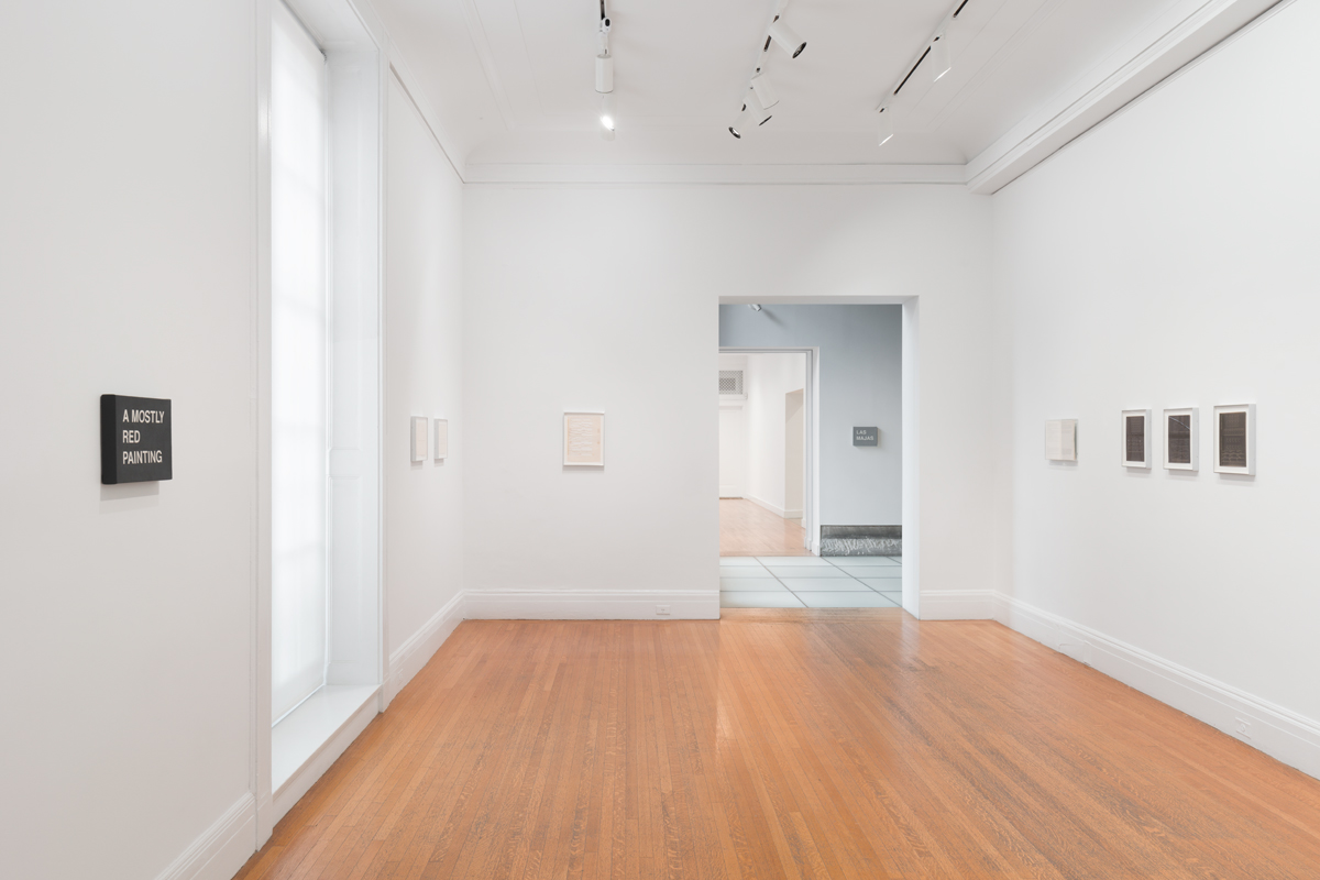 There’s a painting in Christine Kozlov, the survey of the late conceptualist’s work at the American Academy of Arts and Letters, that looks straightforward but isn’t. Just bigger than a letter-size sheet of paper turned on its side, the picture spells out A MOSTLY RED PAINTING in capital sans-serif letters. The white words appear on a dark gray ground; there is no red chroma in it at all. The painting, executed in 1969, made me think of the language games that Jasper Johns set up a decade earlier in False Start (1959), a canvas featuring patches of colors and the words for those colors, which both match and mismatch, collide and diverge. Johns showed how two kinds of intelligibility compete—there’s what we see and what we read—and Kozlov brings the distinction to a head by prying the two apart and then pitting them against each other. But the funny part of the painting is the red (or lack thereof), which raises the question of sound. Red is a homonym for read, and this is a mostly read painting, but the mostly is important: there is still some other way—just barely—to experience the work as well.
