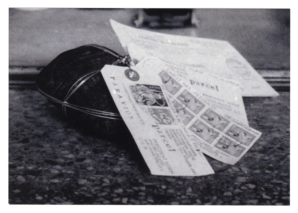 In its emphasis on circulation and distribution, Shinano River Plan also belongs to the practice of mail art, a 1960s movement sustained by a network of participants that collapsed distinctions between artist and viewer, sender and receiver. (Significantly, Horikawa also made ersatz stamps parodying the Japanese prime minister.) Ray Johnson presided over the mail scene with his New York Correspondance [sic] School, sending free, oblique collages, many emblazoned with his signature bunny, to a global constellation of envelope-lickers; in Canada, Image Bank, inspired by Johnson, formed a proto-photo agency, compiling pictures based on their readers’ desires. While sharing similar concerns, including the evasion of the gallery system, Horikawa’s use of the mail is singular in foregrounding matter over image, which is why it seems important that the artist didn’t package his stones but sent them simply wired, out in the open, so as many people as possible might contact—and contemplate—them directly. (Could they be minimalist versions of Chinese gongshi, or scholar’s stones?) While most mail artists were playfully critical of the commodity, Horikawa’s correspondence added a dose of antagonism to boot.