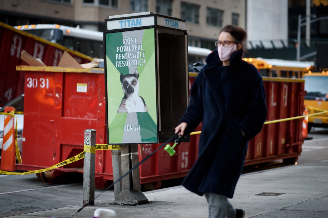 The less successful works in TITAN don’t get how neglected public space has become (the payphone is simply a metonym for its superannuation). Examples of capital-P public art, these interventions brim with the utopian possibility that often accompanies the idea of doing something outside. Equating the street with the public and the masses with politics, these artists seem to have forgotten that their contributions are unique one-offs rather than individual instances of larger campaigns. Patti Smith, for example, offers an encomium to democracy: a photograph of the word Vote written on a Caucasian palm, captioned It’s in our Hands, while Glenn Ligon delivers pictures of two neon sculptures spelling out November 3, 2020 and November 4, 2020, and a photograph of raised hands, promising a paradigm shift on Election Day. Rirkrit Tiravanija blithely encourages passersby to Remember in November. Hans Haacke’s contribution is more far-reaching—a poster he has used on many occasions, declaring, in many languages, We (All) Are the People, bordered by a color-wheel rainbow gradient. Anodyne agitprop, all of these messages struck me as repetitious, complacent, and familiar.