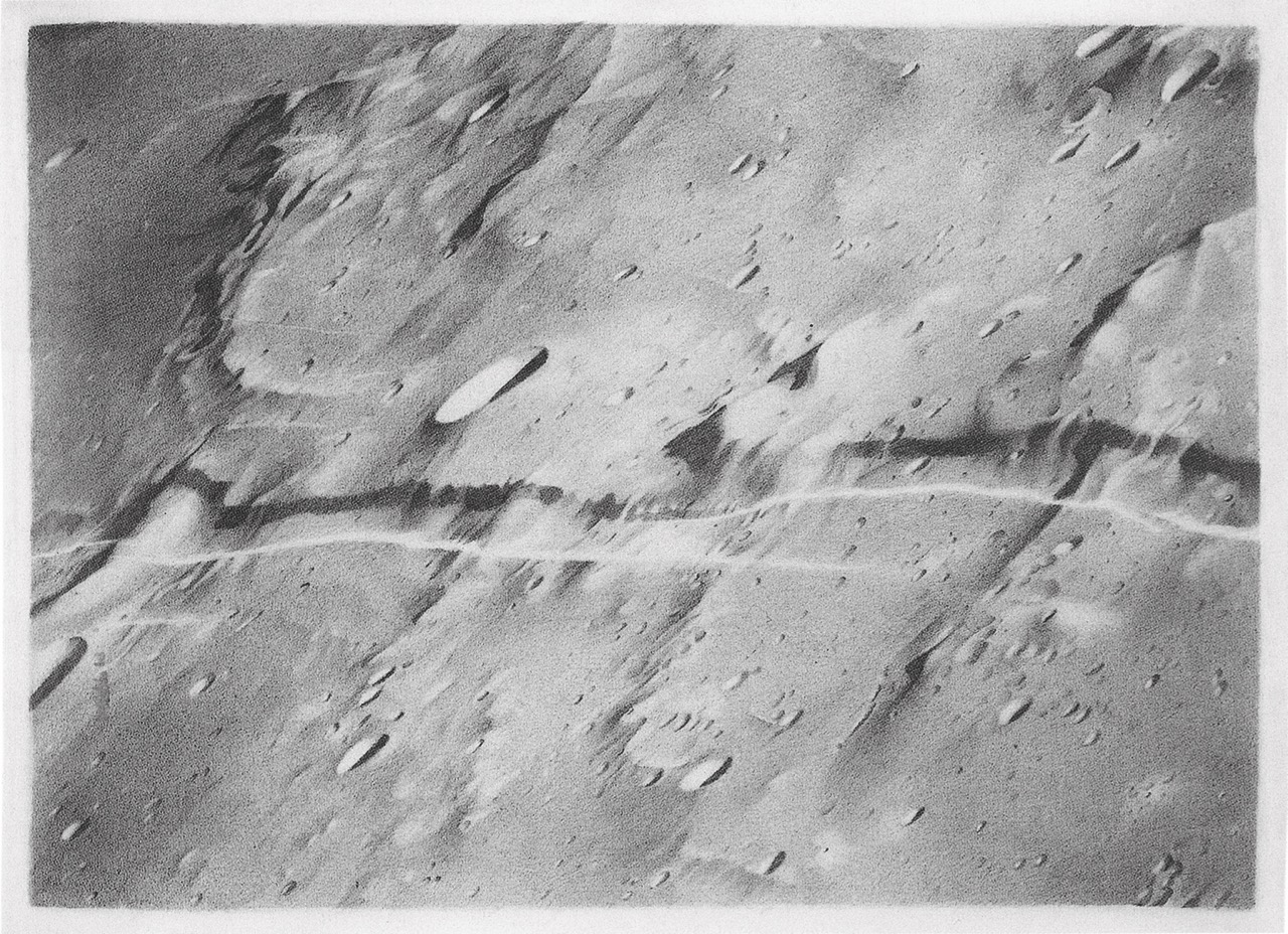 Vija Celmins, Untitled (Moon Surface #1), 1969. Graphite on acrylic ground on paper, 14 1⁄4 × 18 inches. © Vija Celmins, courtesy the artist and Matthew Marks Gallery. Photo: Brian Forrest.