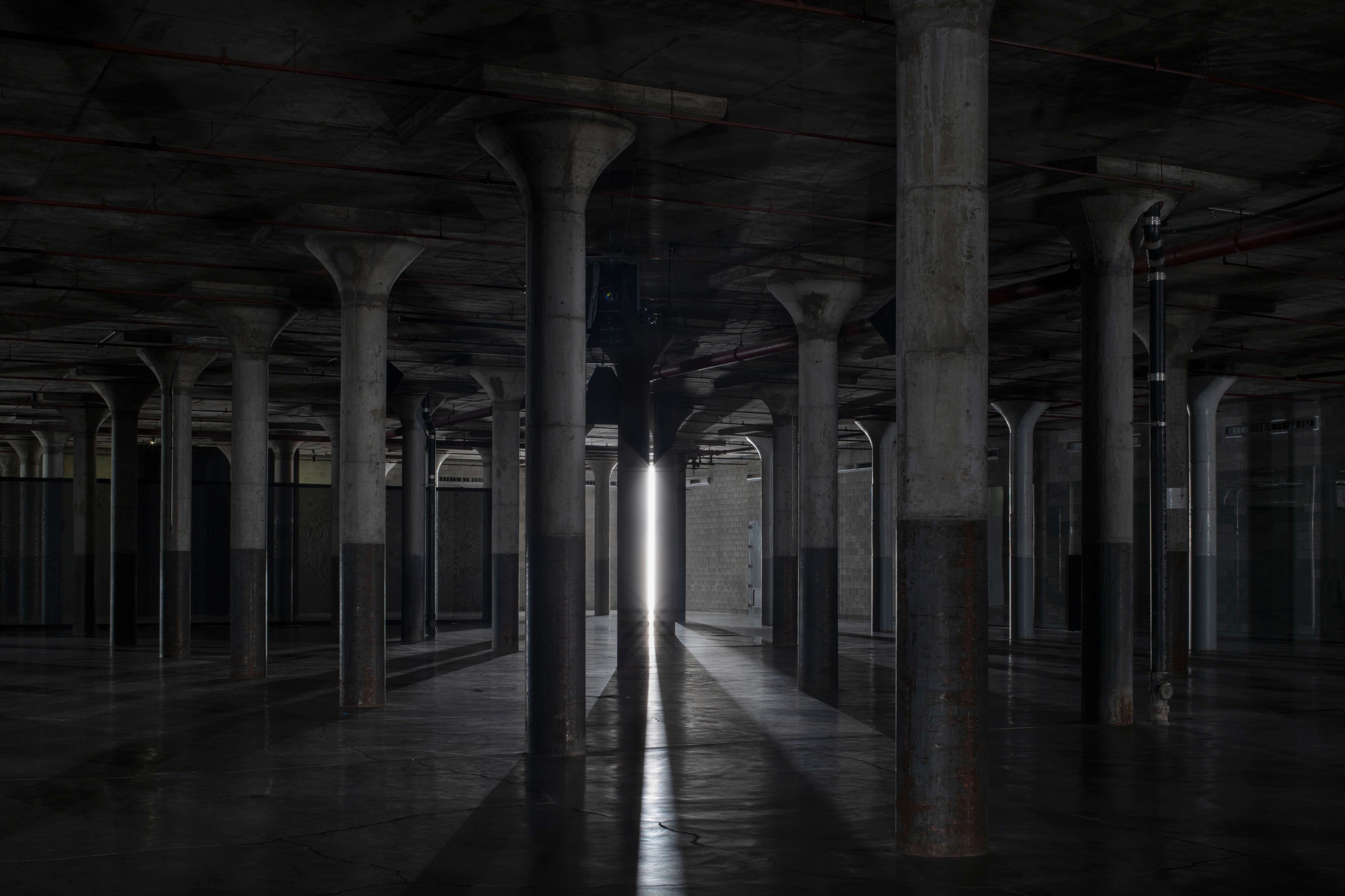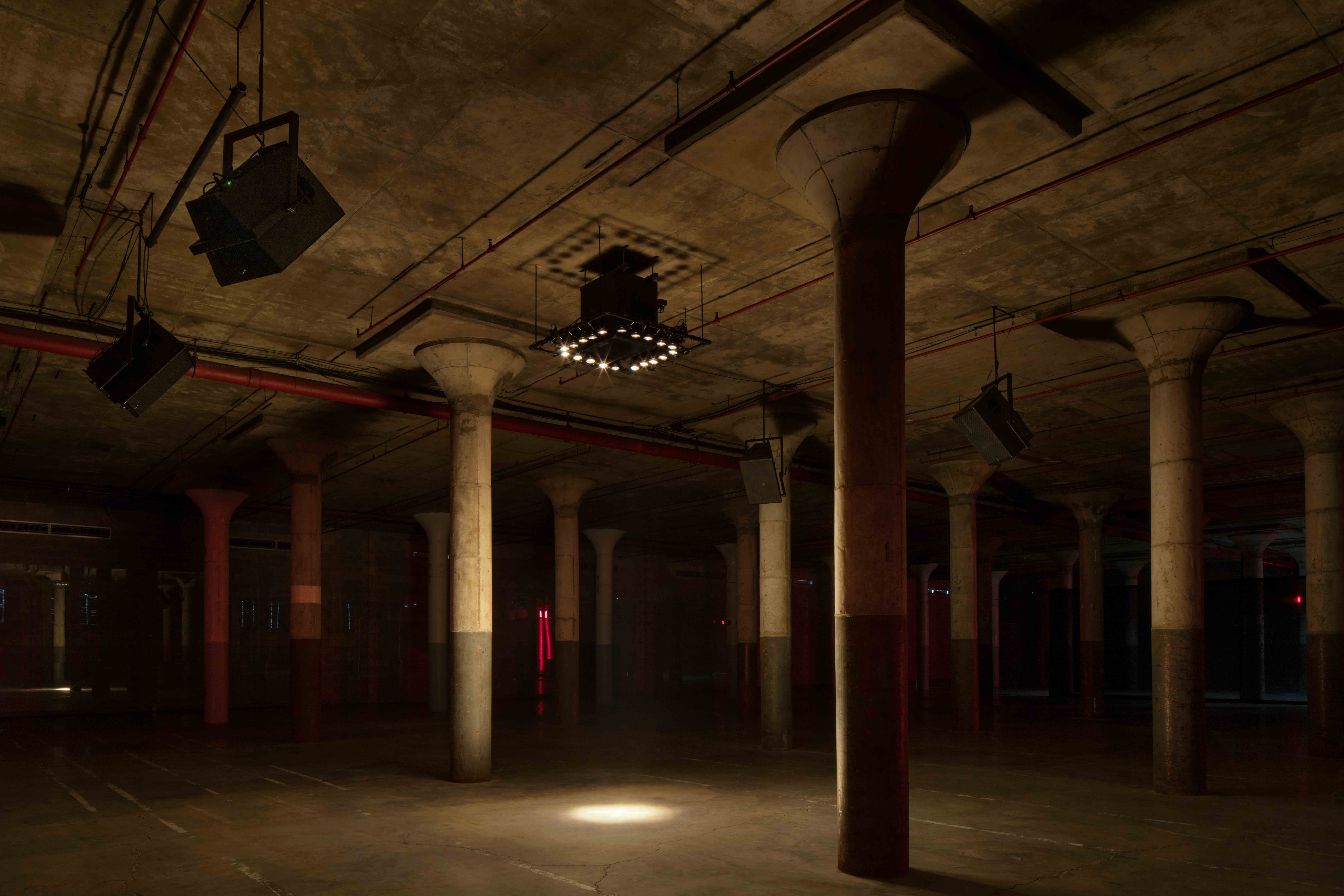 Intermittently, a panel of shutters claps open and shut, allowing a sliver of daylight to momentarily cut through the space, an architectural feature Craig borrowed from Panorama Bar, the dank boîte above Berghain, Berlin’s labyrinthine power plant turned club. LED poles are affixed to the room’s four corners, splashing red, blue, purple, and white hues onto the rows of concrete columns that fortify Dia’s upper level. They seem to pulsate in syncopation with the music—to its backbeat—and at no point do they overpower the aural primacy Craig establishes with his spare install. This darkened expanse punctuated by flashes of light evokes Dia’s other artwork meant for dim ambulation, Walter De Maria’s The Lightning Field (1977). Located in the high desert of New Mexico, De Maria’s massive storm-conductor is made of four hundred steel rods spiked into the earth and arranged in a grid formation measuring one mile by one kilometer. Viewers are invited for one-night stays to witness (or eagerly await) bolts of electricity strike the artwork in front of them. I made the trek in 2014 and spent the night below a quiet sky, kept up because of a calf who had wandered onto the grounds and mooed in loud persistence somewhere from the stygian landscape before me—a sonorous basso moo—all night long.