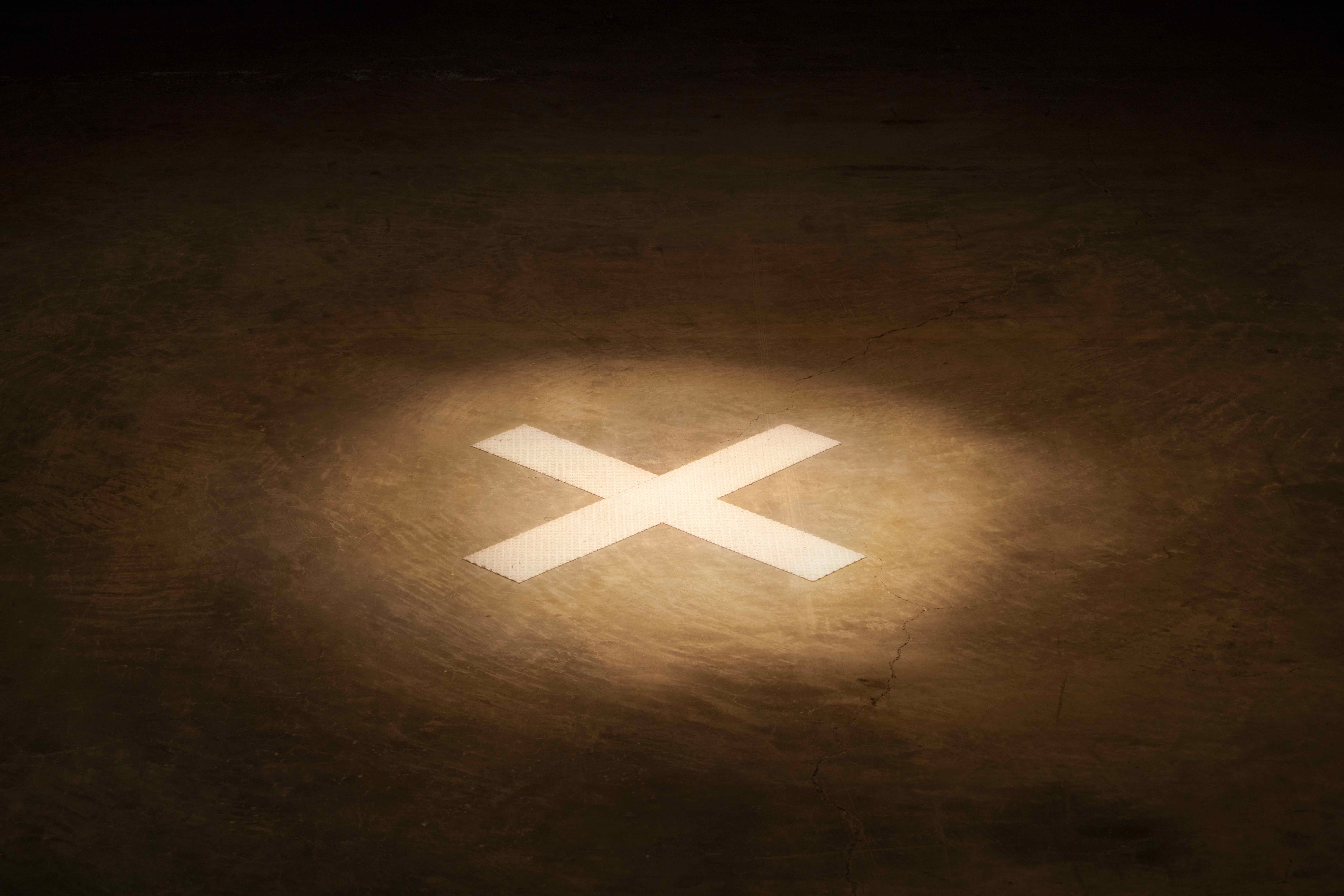 High-pitched curlicues of synth and pockets of reverb bounce off the parameters set for Craig by Dia’s stripped basement walls, curtained with opaque fabric baffles at its two points of entry. Quadrophonic speakers hang from the ceiling around the center of the exhibition space, where a roughly square foot of spotlight illuminates two fat strips of white tape that form an X on the factory floor. The absent host solicits his visitors to stand within, or to walk through, his microclimate of synthetized music. Over the course of thirty minutes, Craig’s suite of music plays out as an emotional diptych: the first half resembles his early work, a lush, analog-hewn jazz-inflected track, with melodies trickling along a firm pulse; the second is down-tempo, almost all pauses, teasing a bass that does not drop. If you remain still, individual notes sound static, buoyed like planets in space. If you choose to move, discrete notes atomize and recombine into thrumming chords of sound.