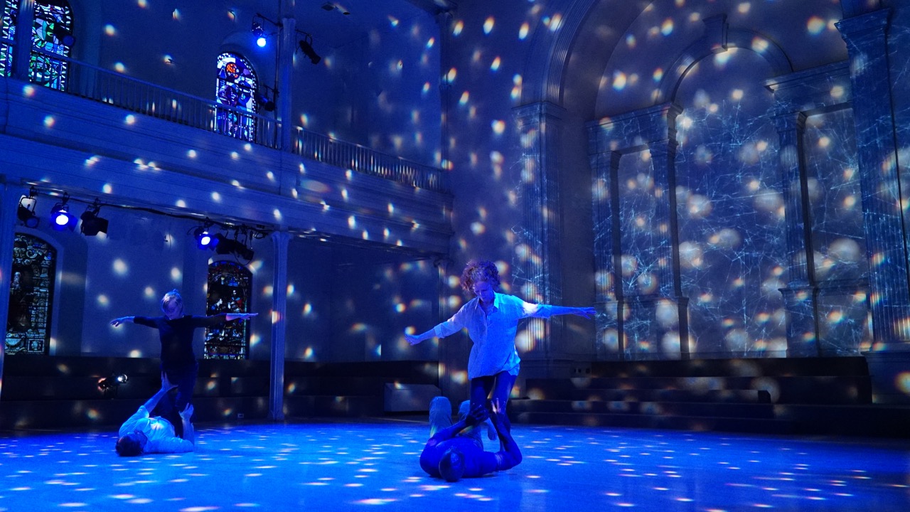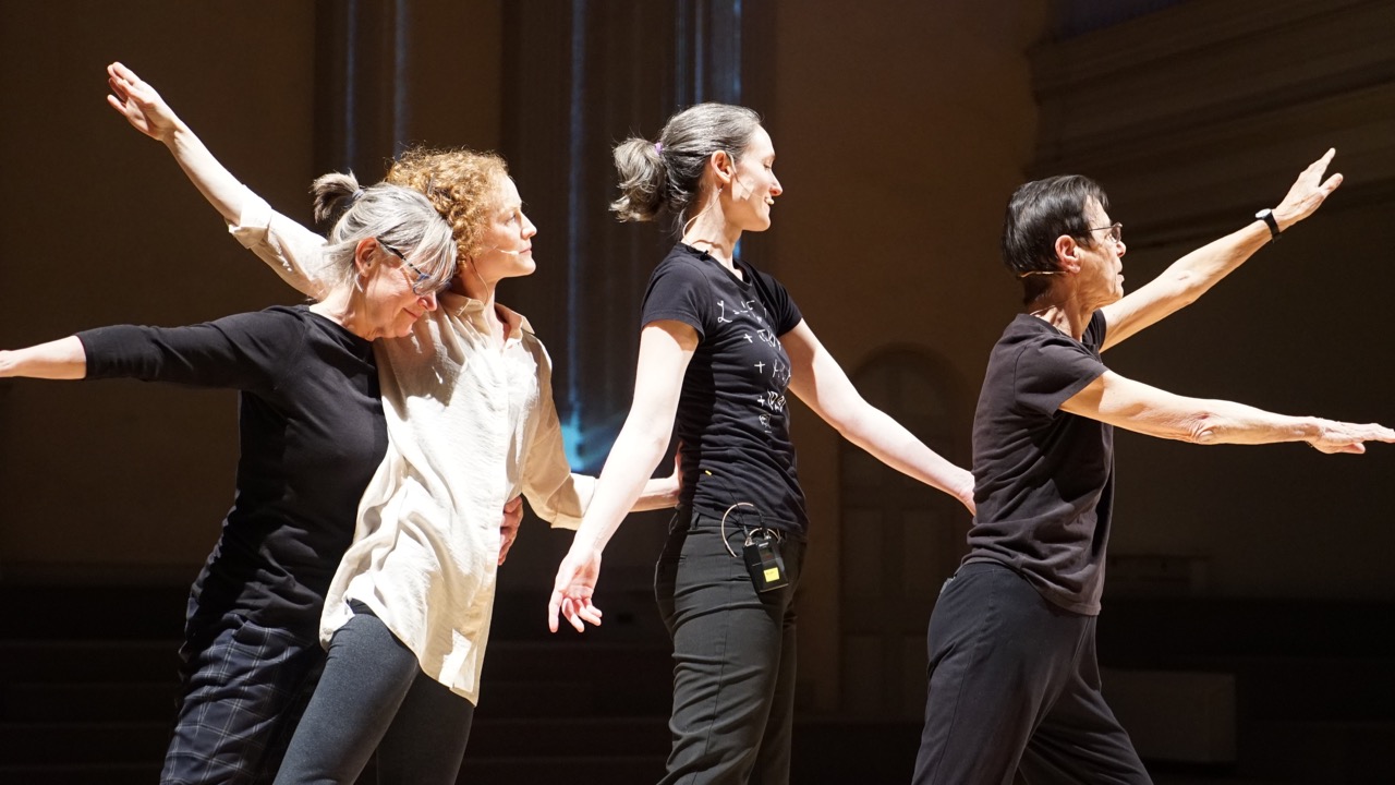 In a film projected on the back wall, we watch an interview with the particle physicist Melissa Franklin as the dancer Jon Kinzel, standing downstage, mirrors her gestures and is soon joined by others—Lacina Coulibaly, Iréne Hultman, and Coates. Serene, somehow evoking a quietly slow-motion cascade of falling snow, they swirl around the stage under cool blue lighting, seemingly floating until gravity takes over and they melt to the floor. Are they dancers or glittering particles? Somehow, a bit of both.
