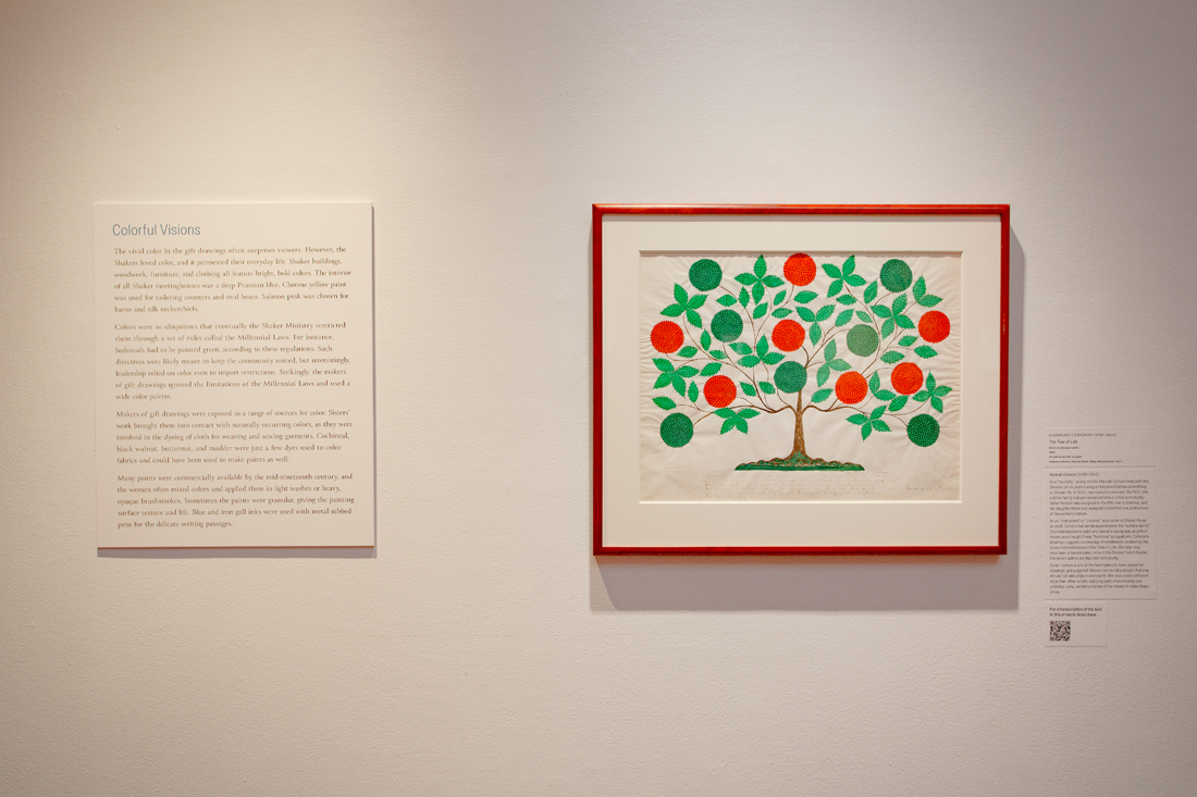 Anything but Simple: Gift Drawings and the Shaker Aesthetic, installation view. Courtesy American Folk Art Museum. Pictured, right: Hannah Cohoon, The Tree of Life, 1854.
