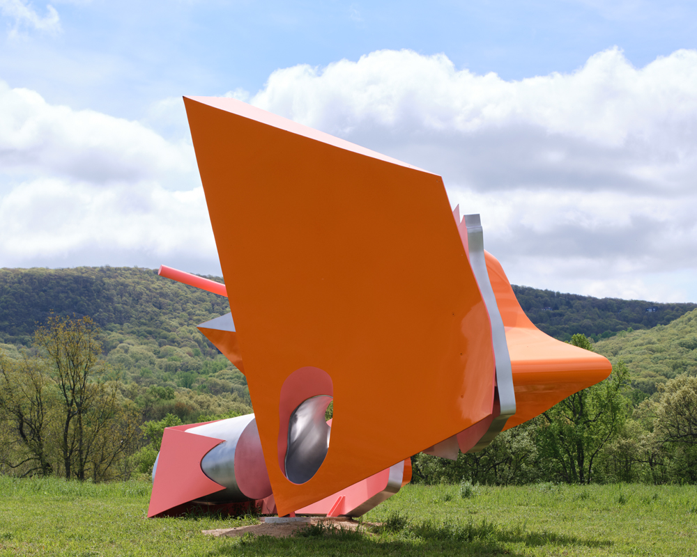 Girl Group is also a mischievous jab at Storm King’s “boy band,” which is made up of some of the all-stars of public art: Calder, Caro, Serra, Moore, and more. To be fair, it’s a genre that unleashes a certain machismo in all genders, calling forth derring-dos of scale, material, and engineering. Mark di Suvero’s gargantuan Figolu (2005–11) frames the skyscape and landscape with its bright orange-red beams, one of which boasts three enormous steel balls dangling from its tip. (The joke writes itself, I suppose.) There can be a gaudiness to that kind of artificial danger, which also reduces works like Menashe Kadishman’s Suspended (1977) into something closer to a theme-park attraction: a balancing act of extreme tonnage that merely sets the stage for a death-defying photo op. For all its pristine fabrication and optical delight, the gleaming white cubes of Sol LeWitt’s Five Modular Units (1971, refabricated 2008) look so, well, square against the lush grass and rustling trees. Up the hill from LeWitt, however, is the balm of Martin Puryear’s breathtaking Lookout (2023), a meticulously crafted, bulbous brick shelter punctured all over with oculi to offer the elements welcome refuge, too. Standing in its center, one is treated to a perfectly framed view of Storm King’s glories.