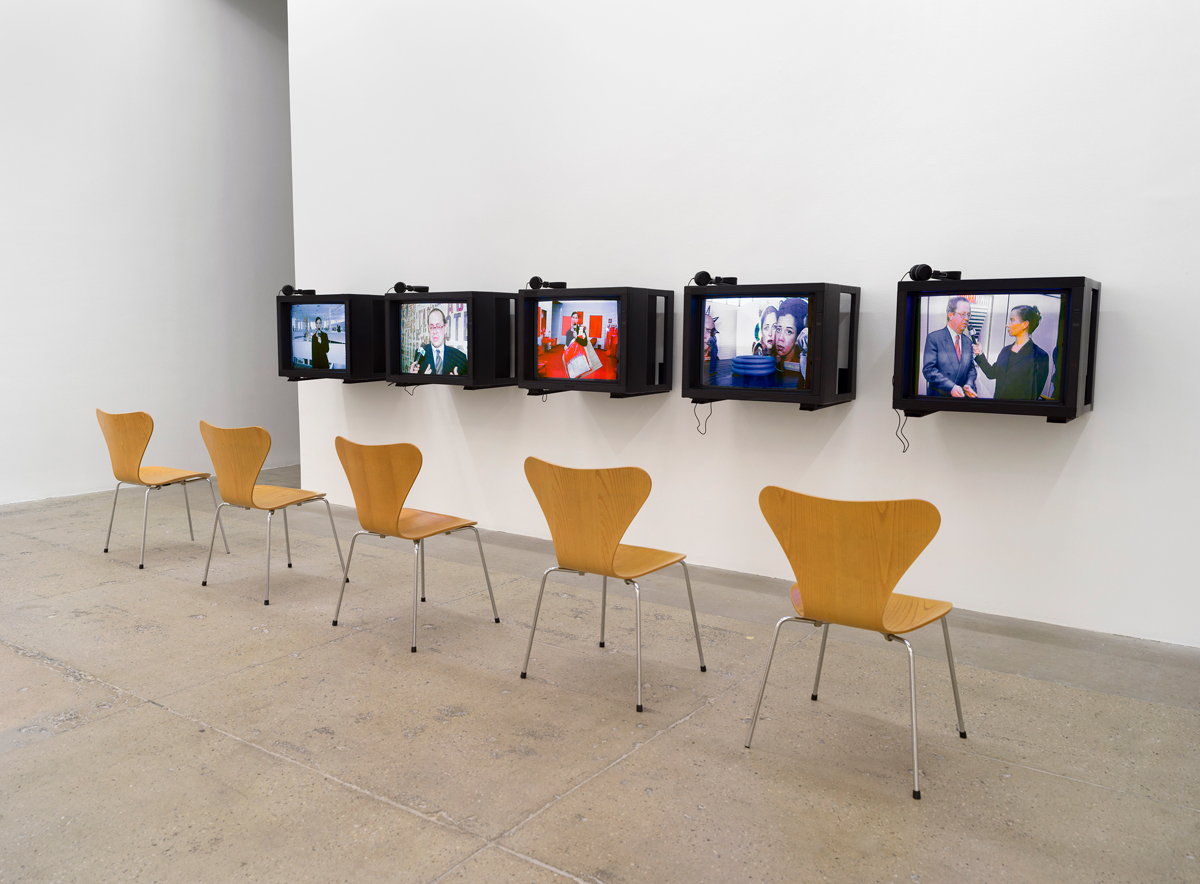 Duly adjacent is Reporting from São Paulo, I’m from the United States (1998), a five-channel video installation of CRT monitors with chairs and headphones. As gifted a performer as she is a rigorous thinker and writer, Fraser takes up various guises throughout the show. Here, as an on-the-ground reporter at the 24th São Paulo Biennial, she conducts decidedly credible made-for-TV interviews (on anthropophagia/cannibalism, the biennial’s theme; art’s role in Brazil’s economic and global ambitions) with visitors, the chief curator, the cultural minister, and other officials of the international event. Demonstrating Fraser’s well-honed sense of the absurd, the broadcast footage includes interviews with herself as a participant-artist.