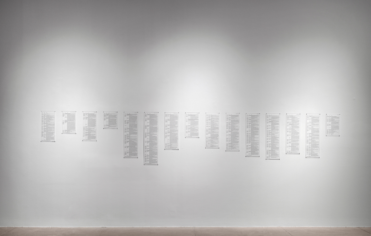 Andrea Fraser, installation view. Courtesy the artist and Marian Goodman Gallery. Photo: Alex Yudzon. © Andrea Fraser. Pictured: This meeting is being recorded: Rehearsal script draft 11, table 8, 2021/2022.